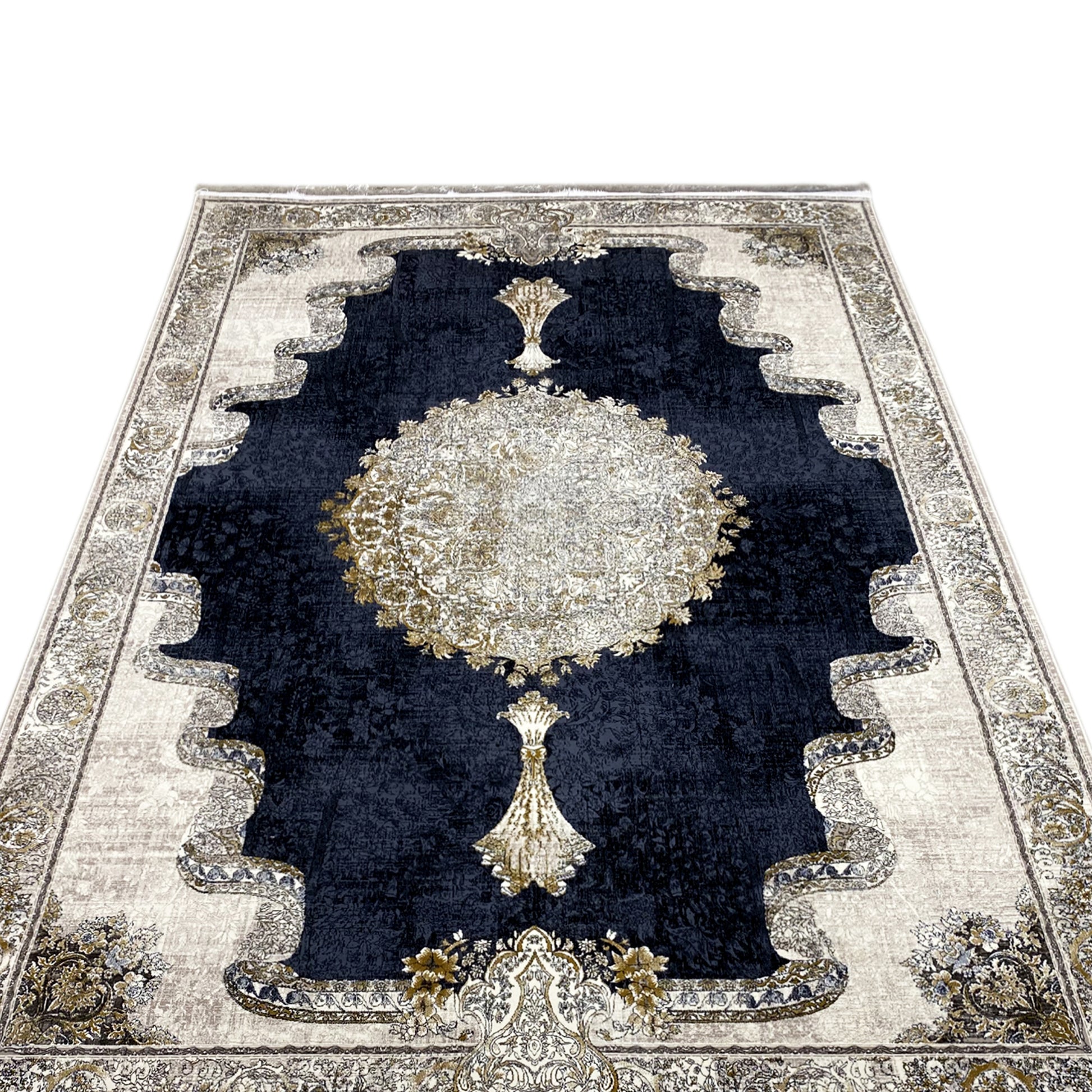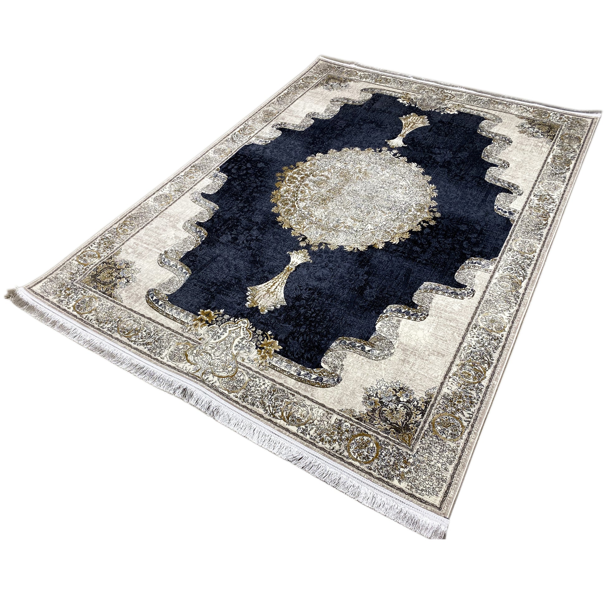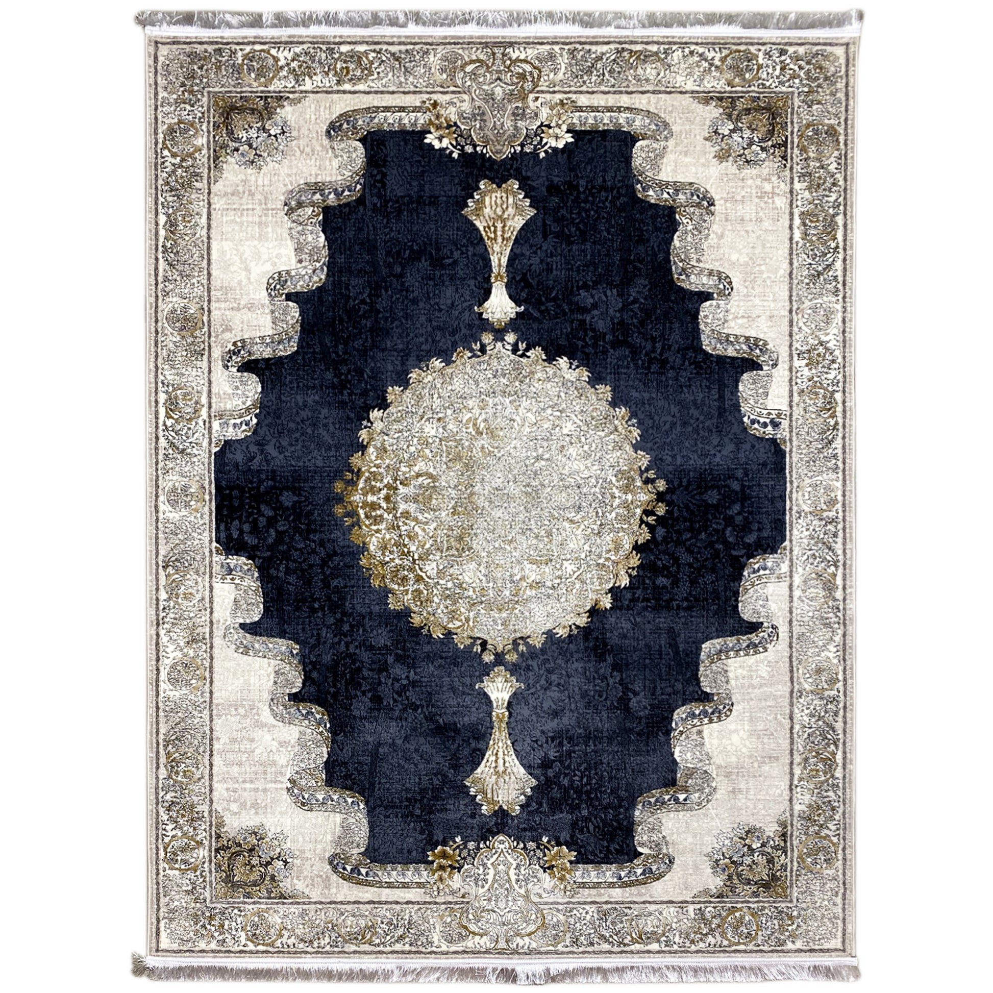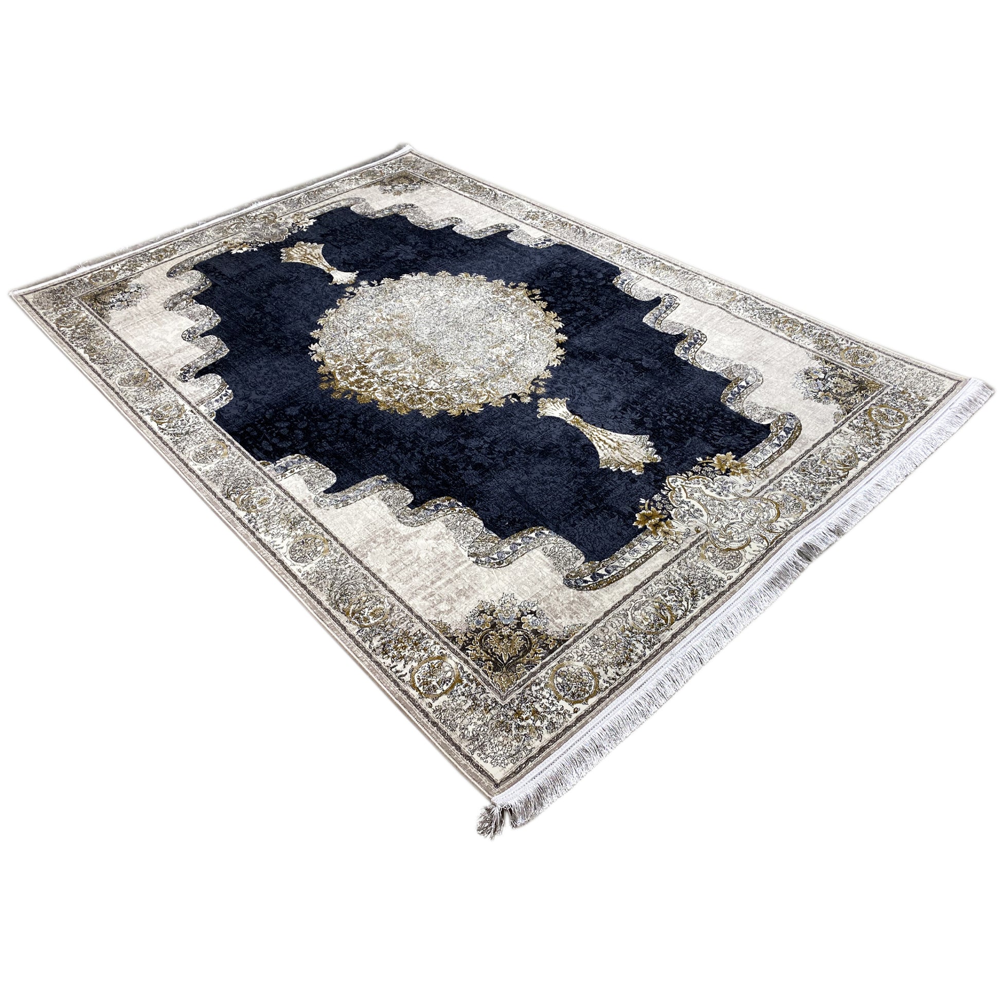 Enhance your home with the striking classic Arcadian Dusk rug. Its refined navy blue field is beautifully framed by a lighter, metallic border, creating a dramatic focal point. The central medallion and detailed border give this rug an element of artistic, traditional design. Made from 100% heat-treated acrylic, this rug offers a luxurious feel and is perfect for high-traffic areas, combining timeless style with modern durability. The generous size of 170x240cm is ideal for defining your living or bedroom space.