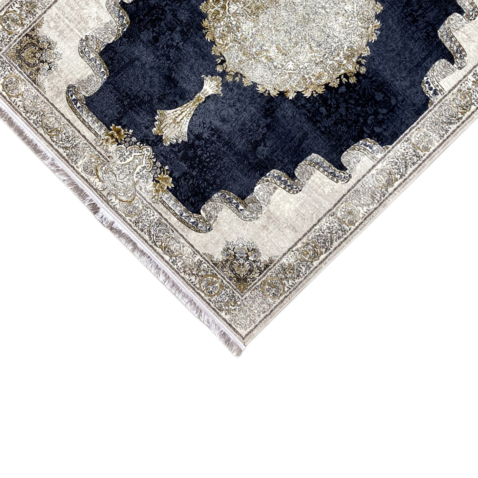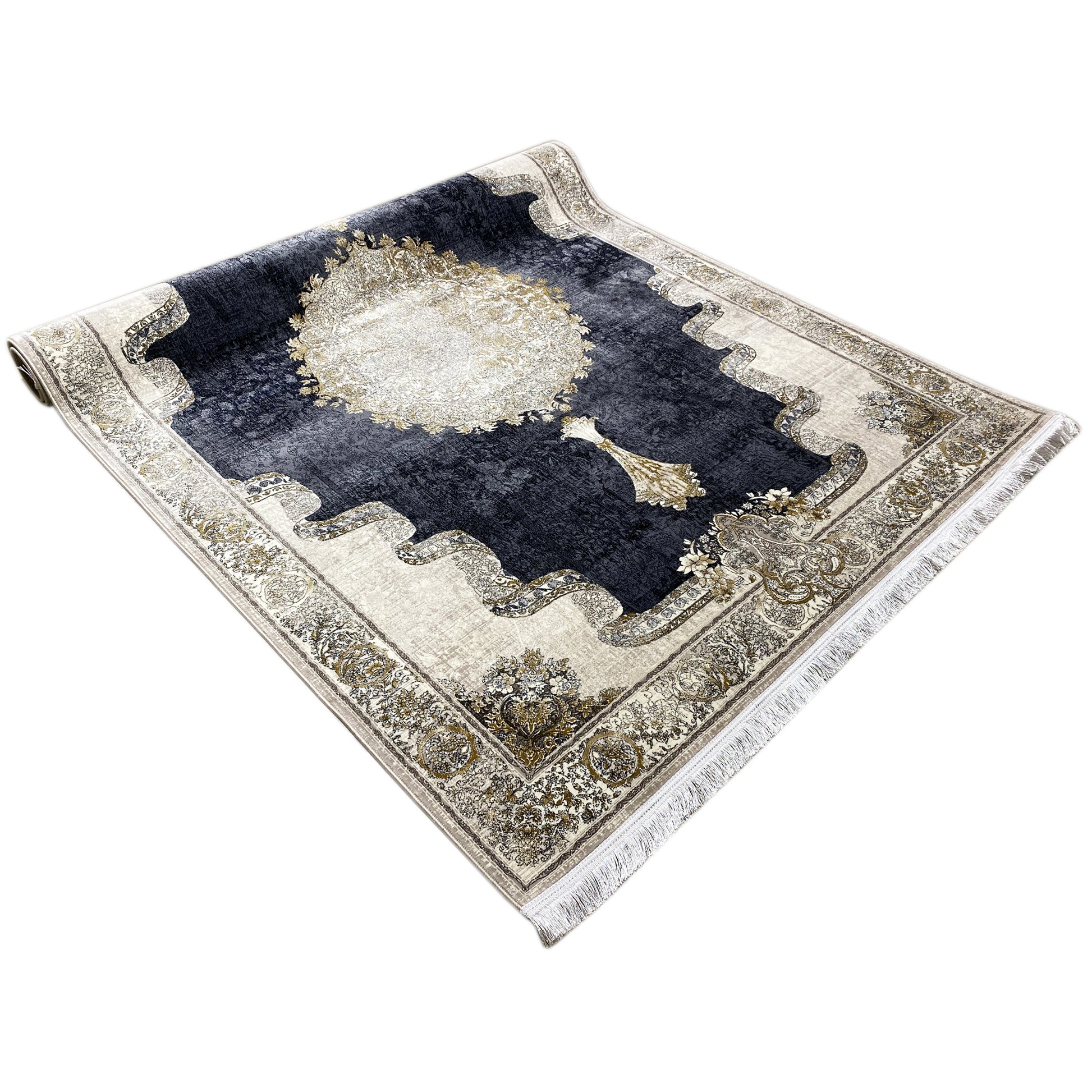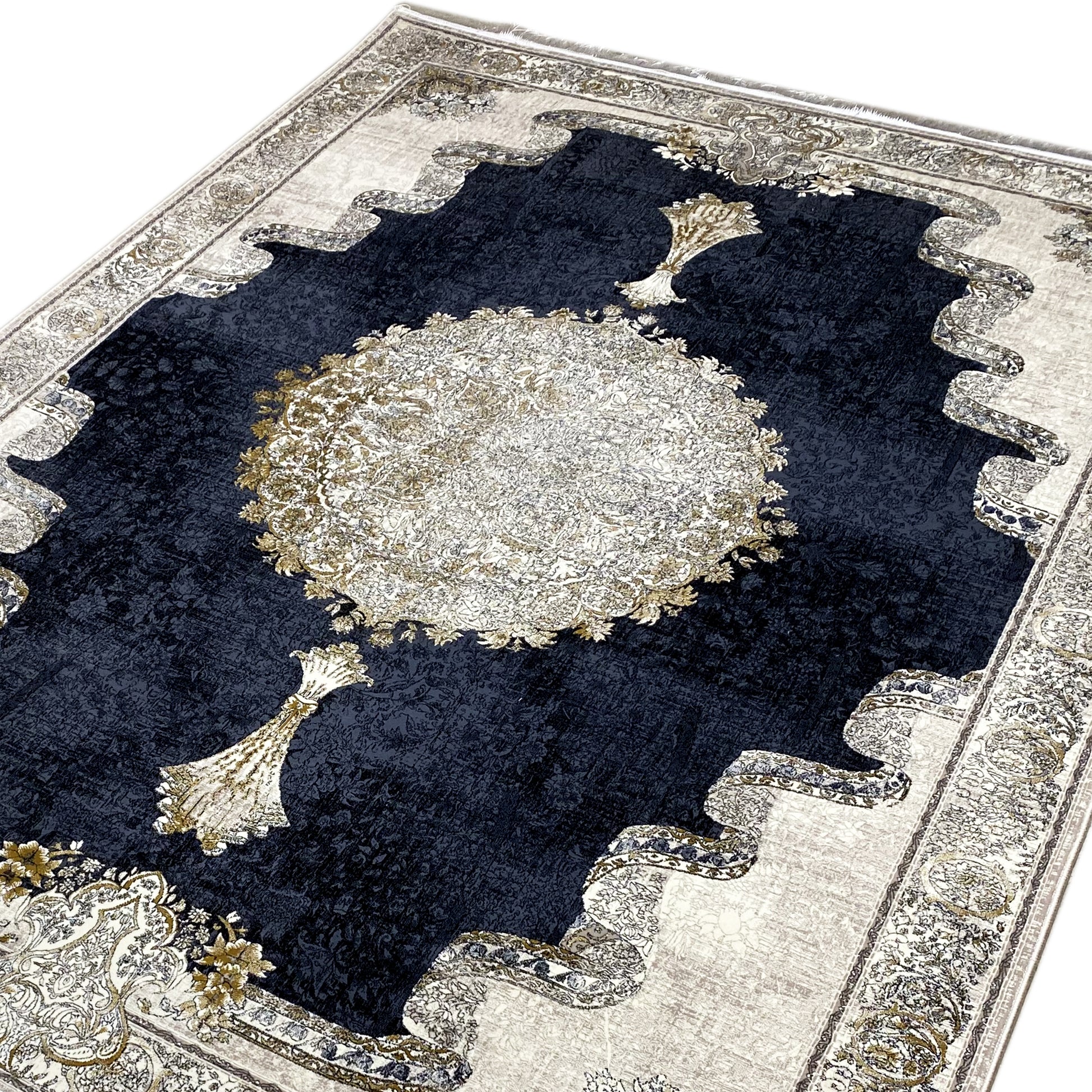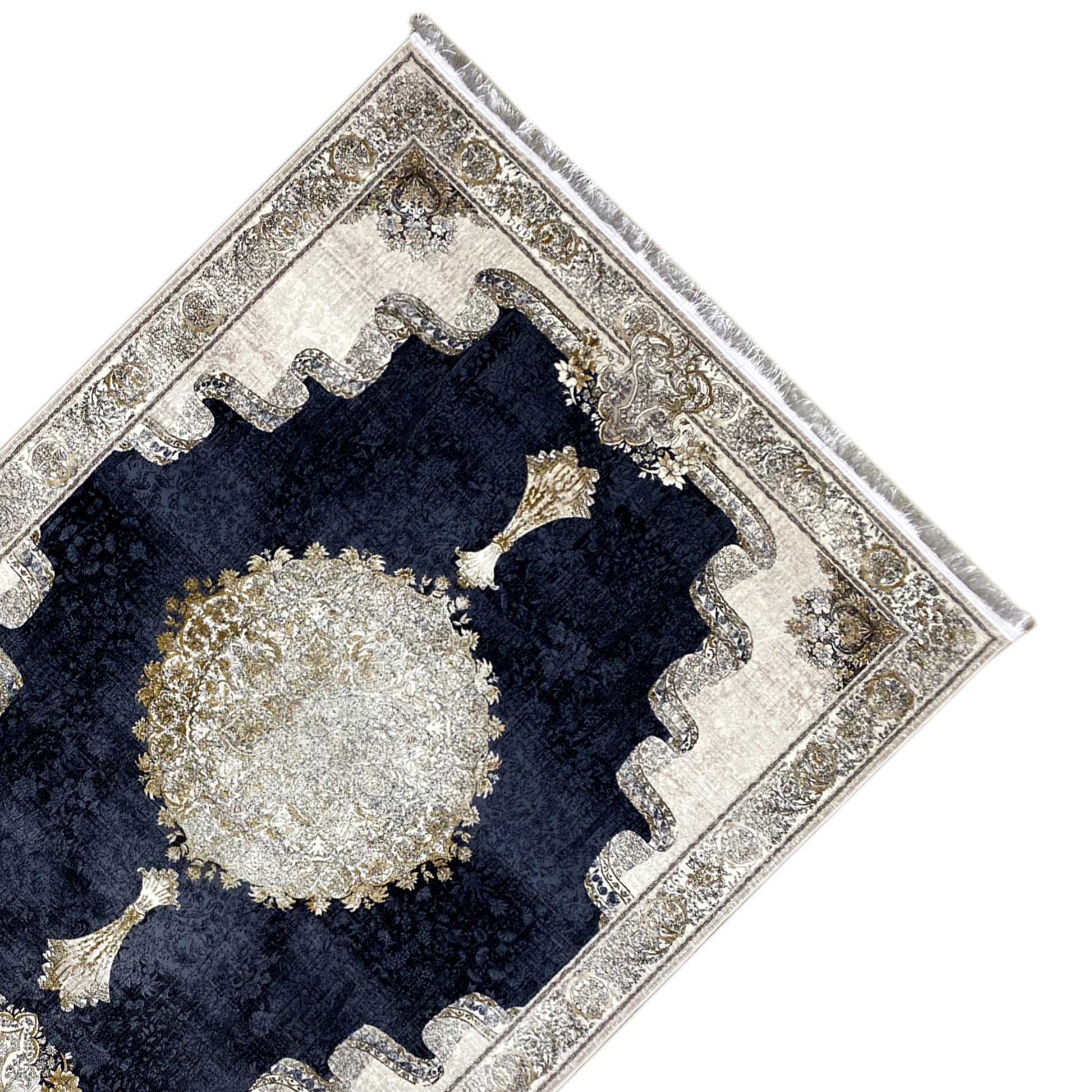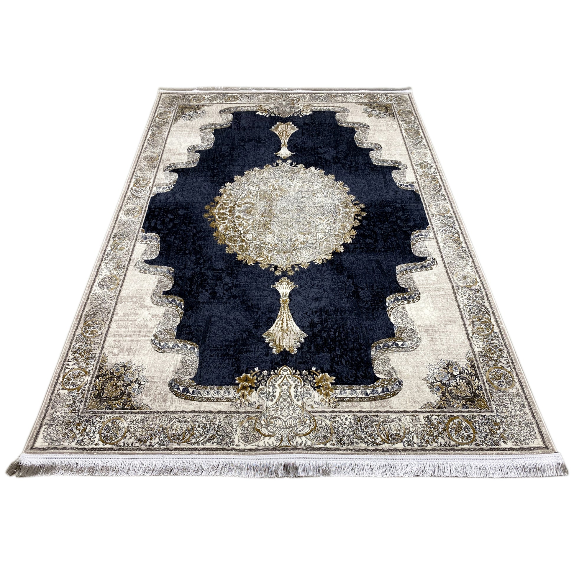 Enhance your home with the striking classic Arcadian Dusk rug. Its refined navy blue field is beautifully framed by a lighter, metallic border, creating a dramatic focal point. The central medallion and detailed border give this rug an element of artistic, traditional design. Made from 100% heat-treated acrylic, this rug offers a luxurious feel and is perfect for high-traffic areas, combining timeless style with modern durability. The generous size of 170x240cm is ideal for defining your living or bedroom space.