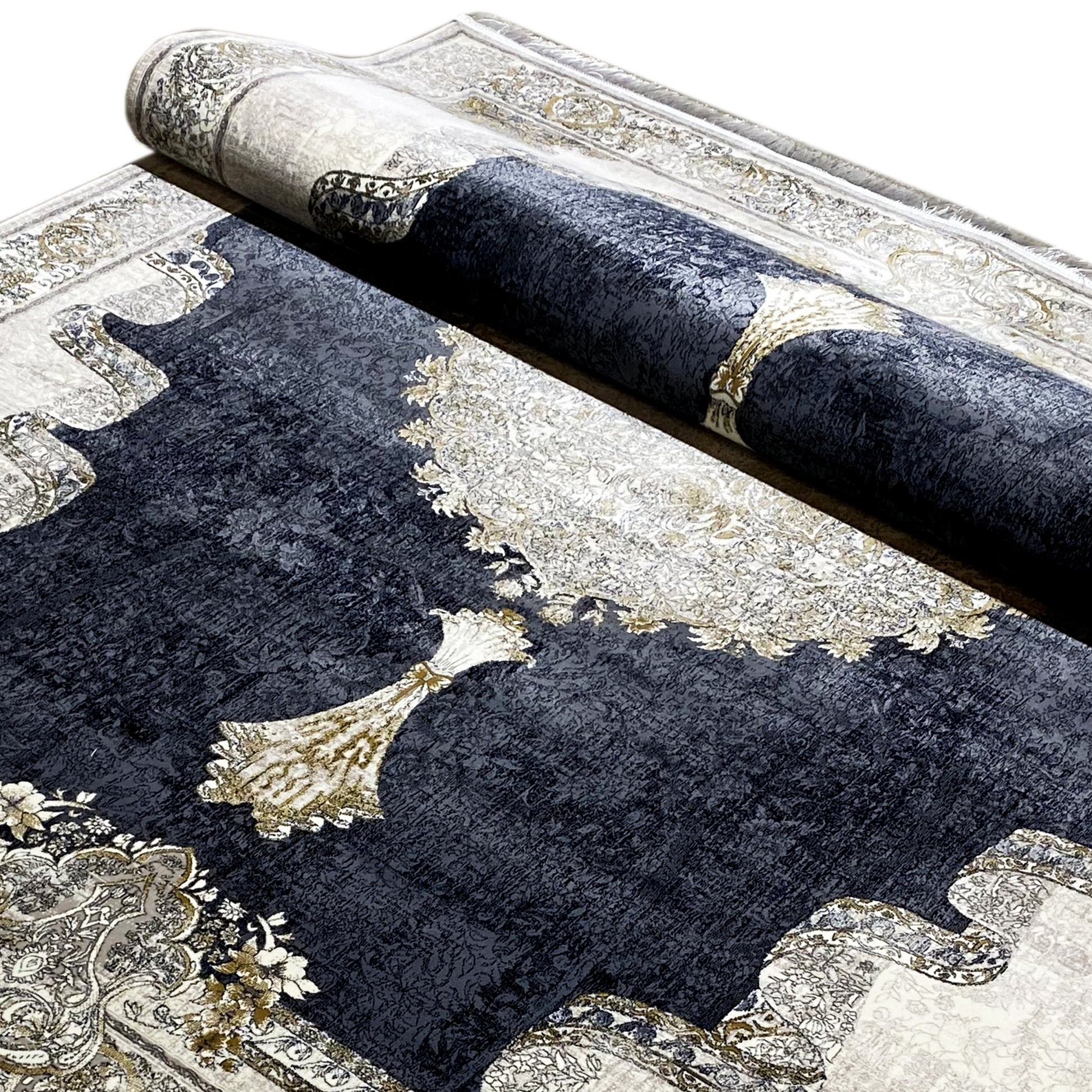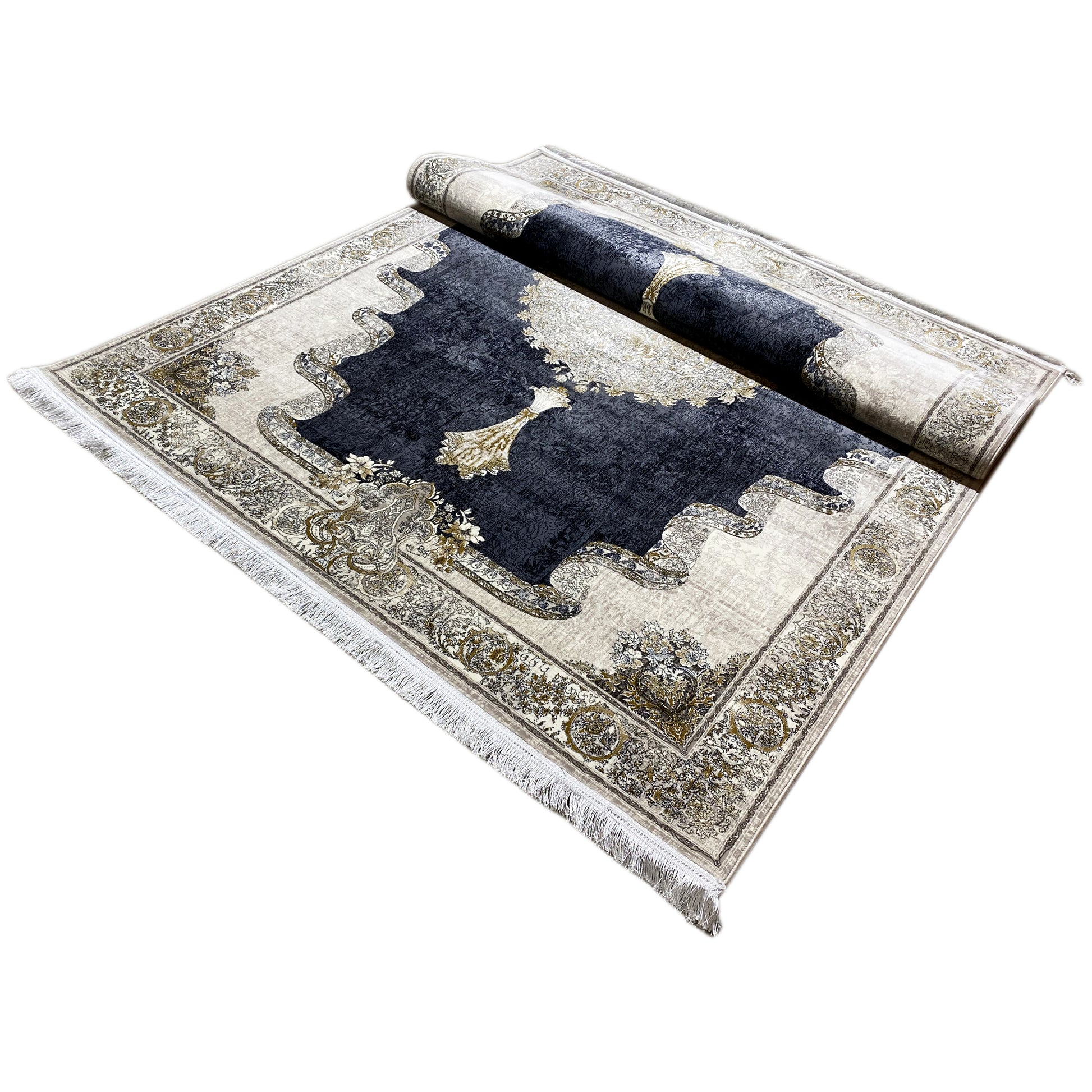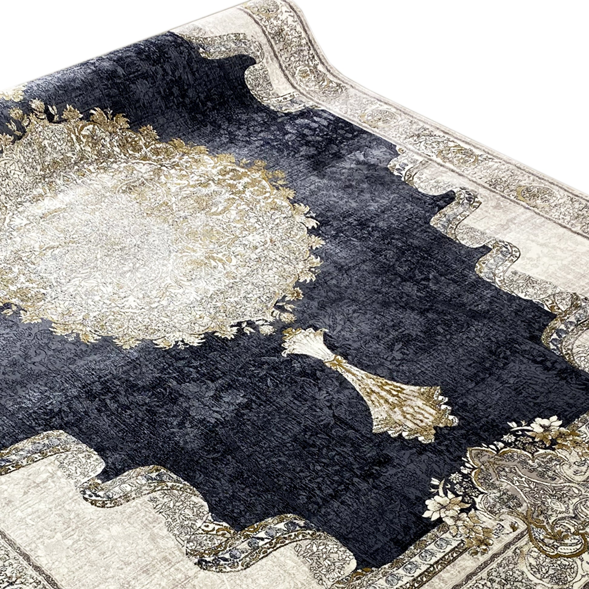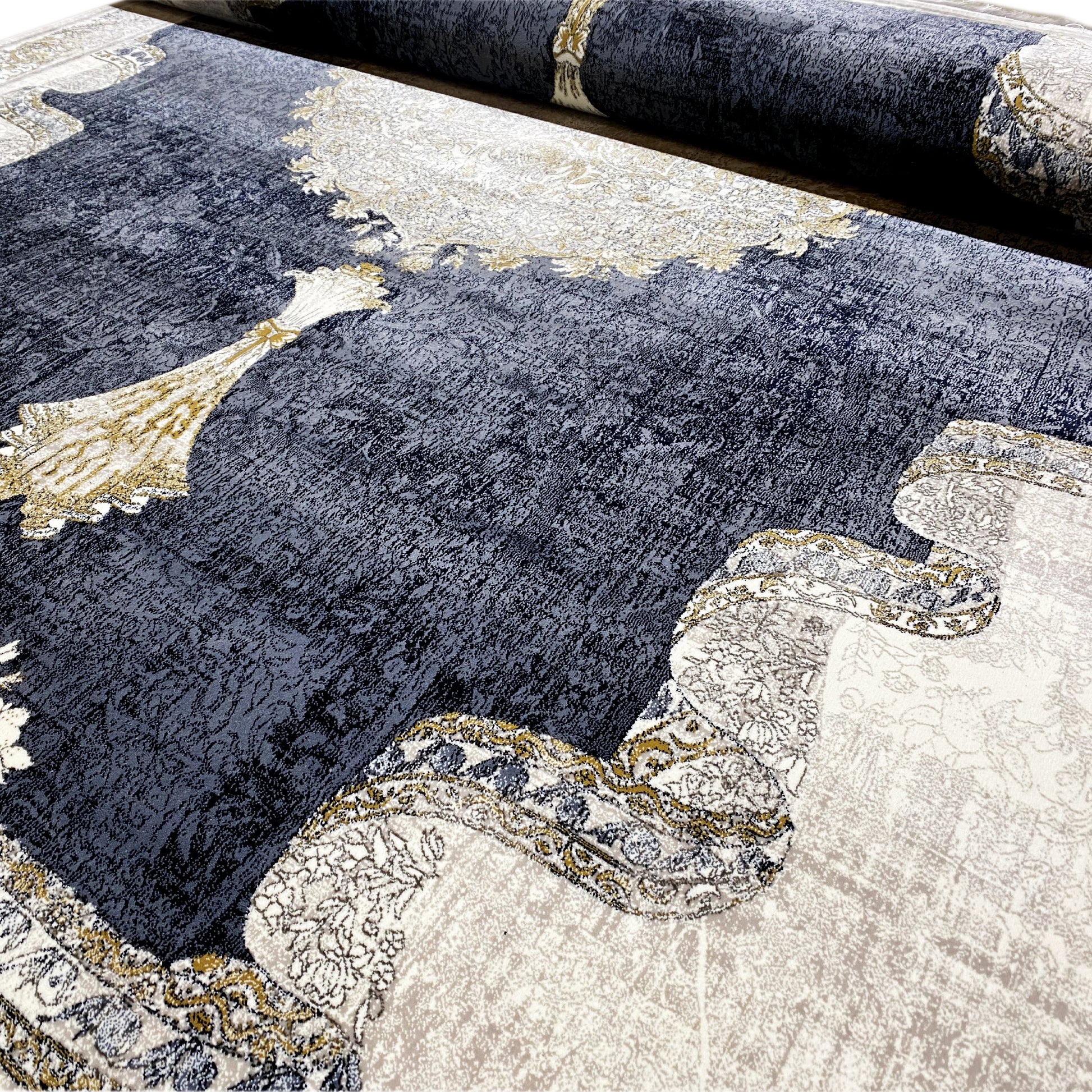 Enhance your home with the striking classic Arcadian Dusk rug. Its refined navy blue field is beautifully framed by a lighter, metallic border, creating a dramatic focal point. The central medallion and detailed border give this rug an element of artistic, traditional design. Made from 100% heat-treated acrylic, this rug offers a luxurious feel and is perfect for high-traffic areas, combining timeless style with modern durability. The generous size of 170x240cm is ideal for defining your living or bedroom space.