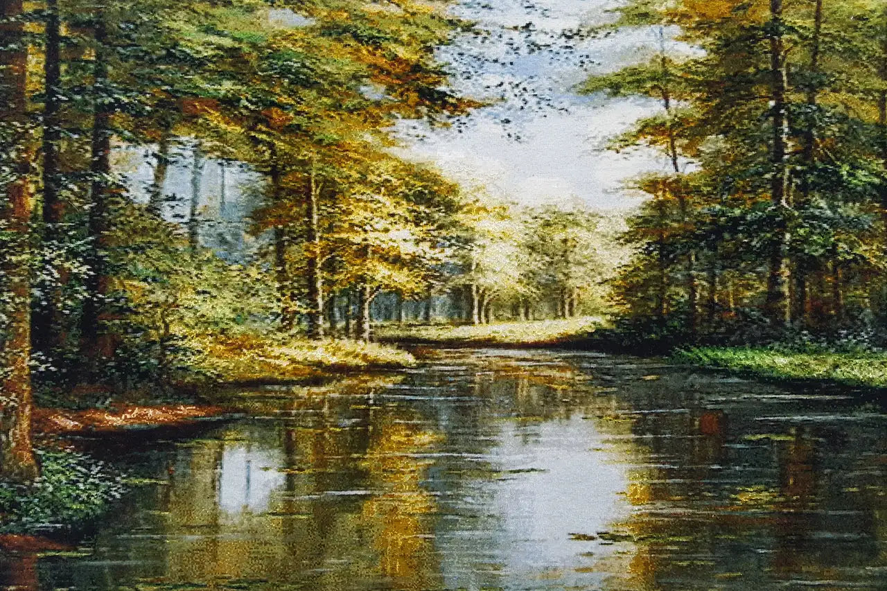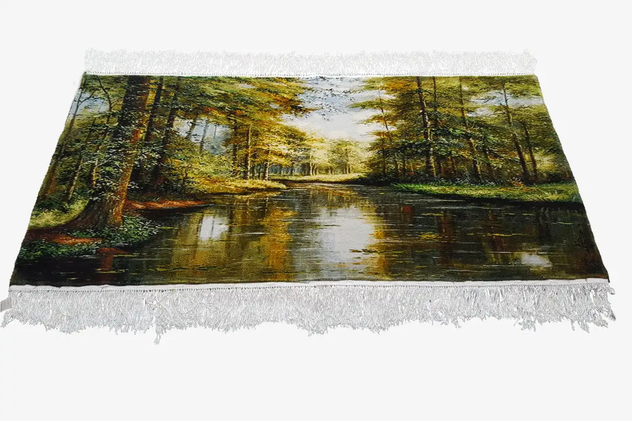 This unique, hand-knotted pictorial carpet measuring 127x62cm is made from a noble blend of wool and silk. It depicts a detailed, figurative forest landscape with a peacefully flowing river, creating a calm and natural atmosphere. Framed in an ornate, classical style, this pictorial carpet serves as an impressive wall hanging that adds an artistic and elegant touch to any rustic or classical interior.