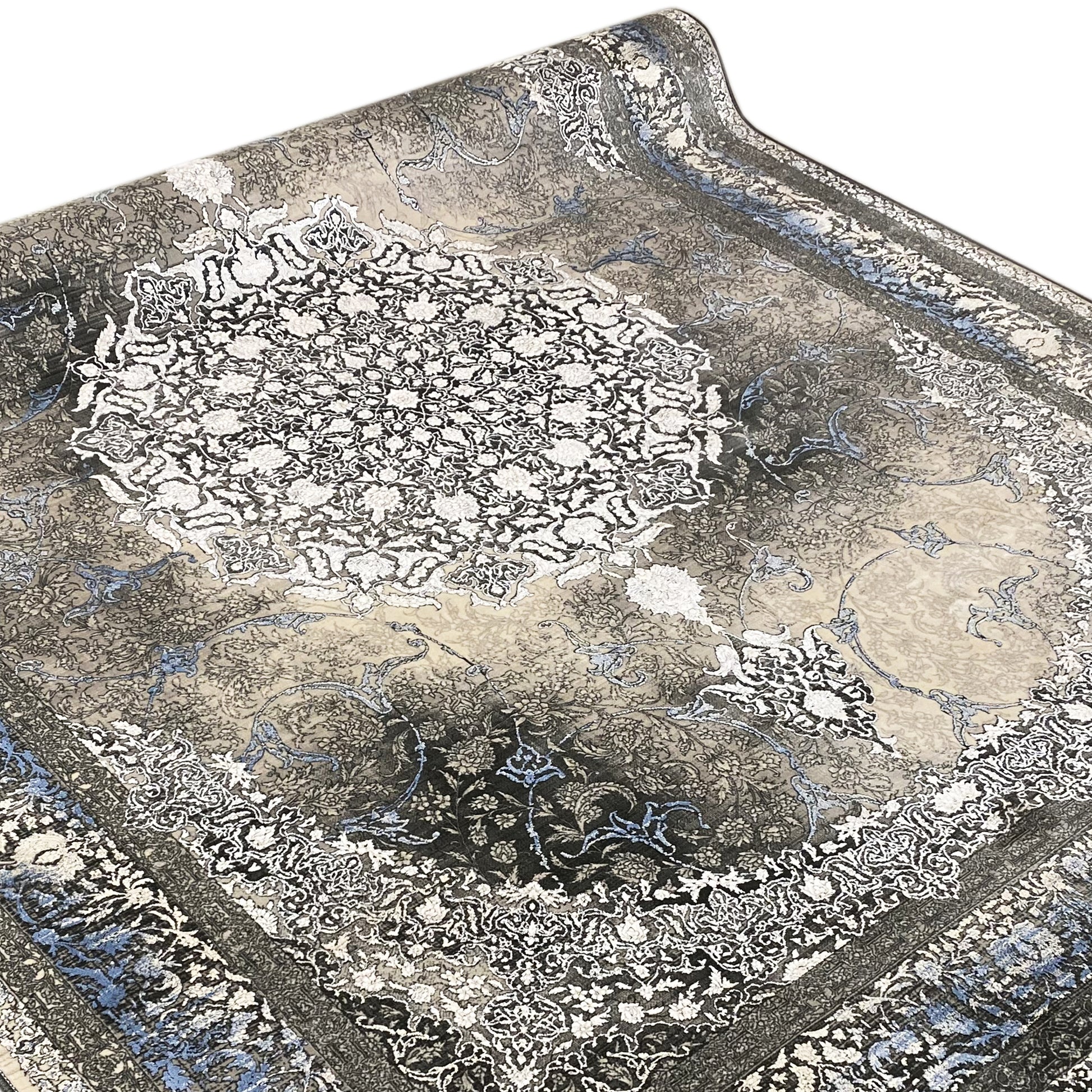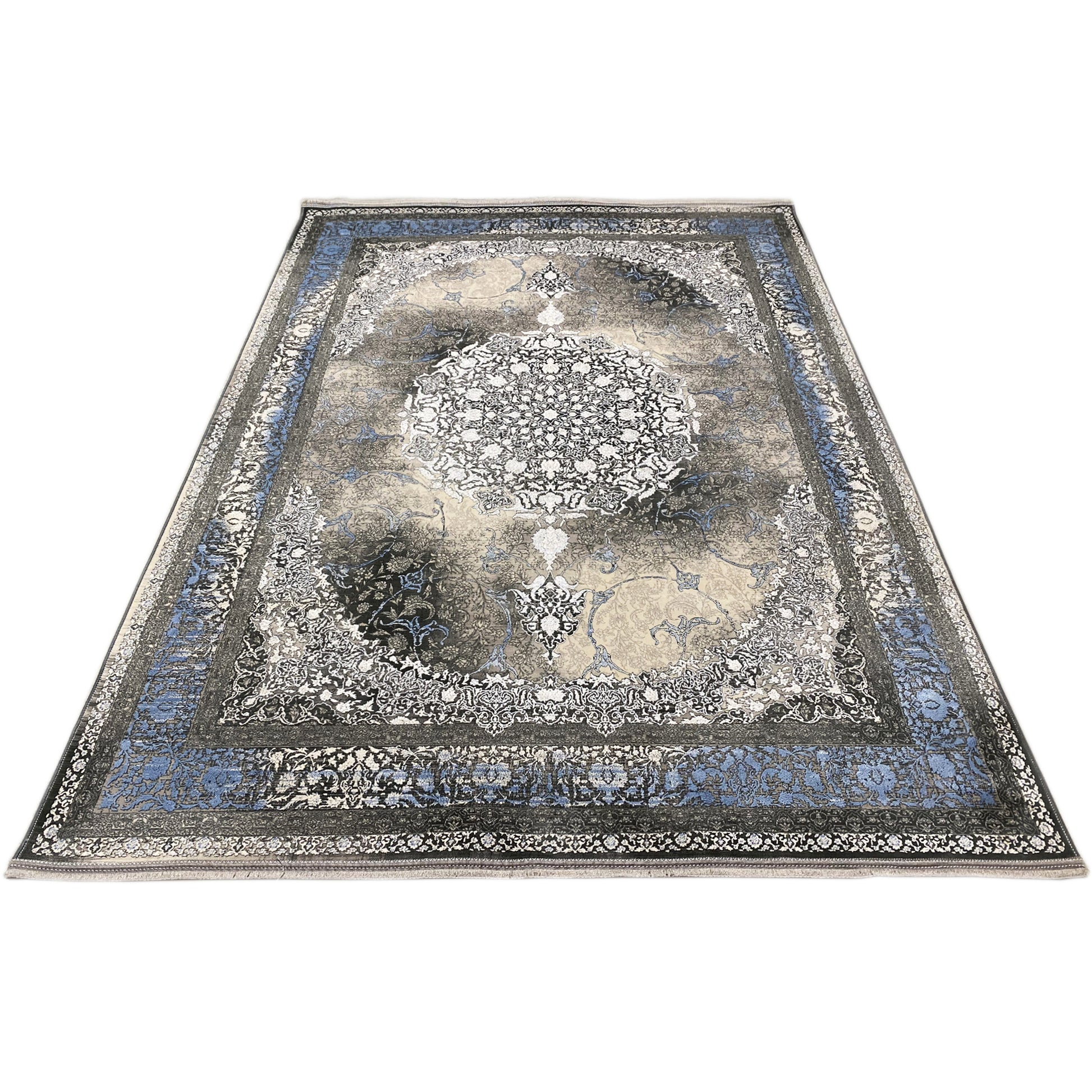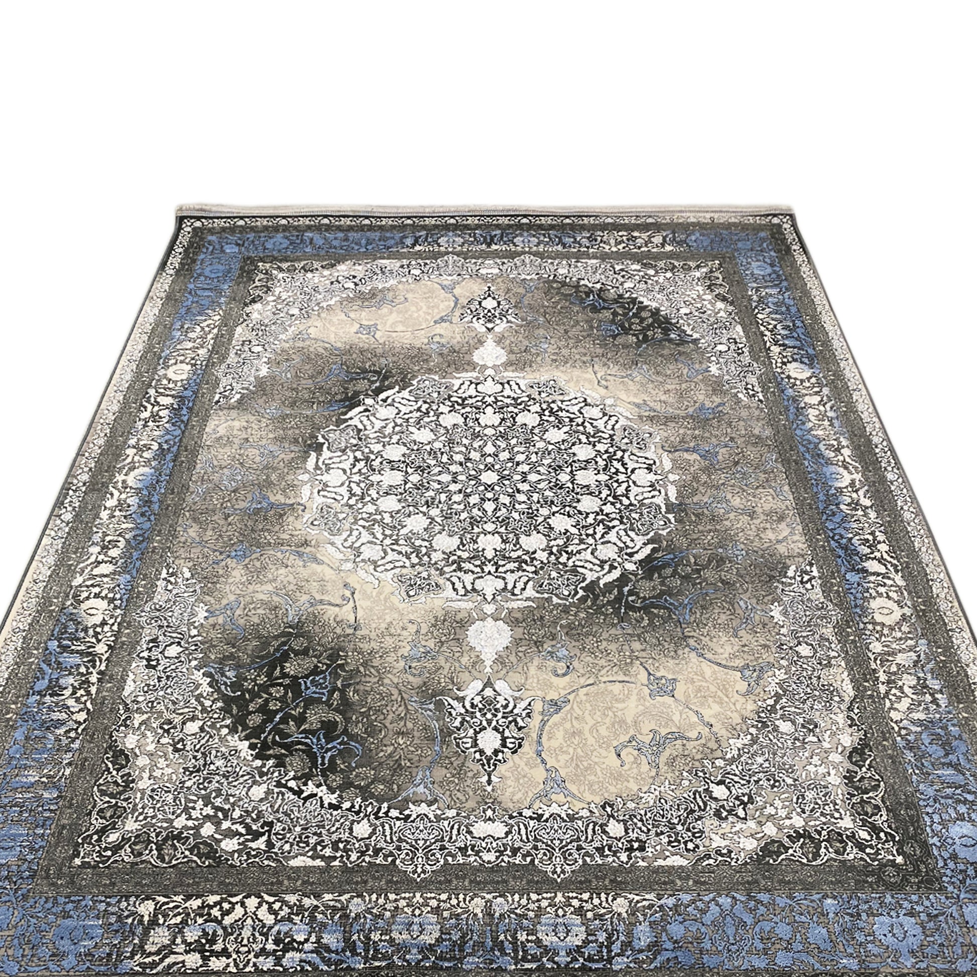 Add a touch of timeless elegance to your home with this beautiful classic rug. The artistic central medallion in cream and gray tones stands out against a smoky, subtly faded background framed by a vibrant blue border. Made from 100% heat-treated acrylic, this soft and durable rug is perfect for high-traffic areas, combining luxurious style with modern resilience. The generous size of 170x240cm is ideal for adding an elegant focal point to your living or bedroom.