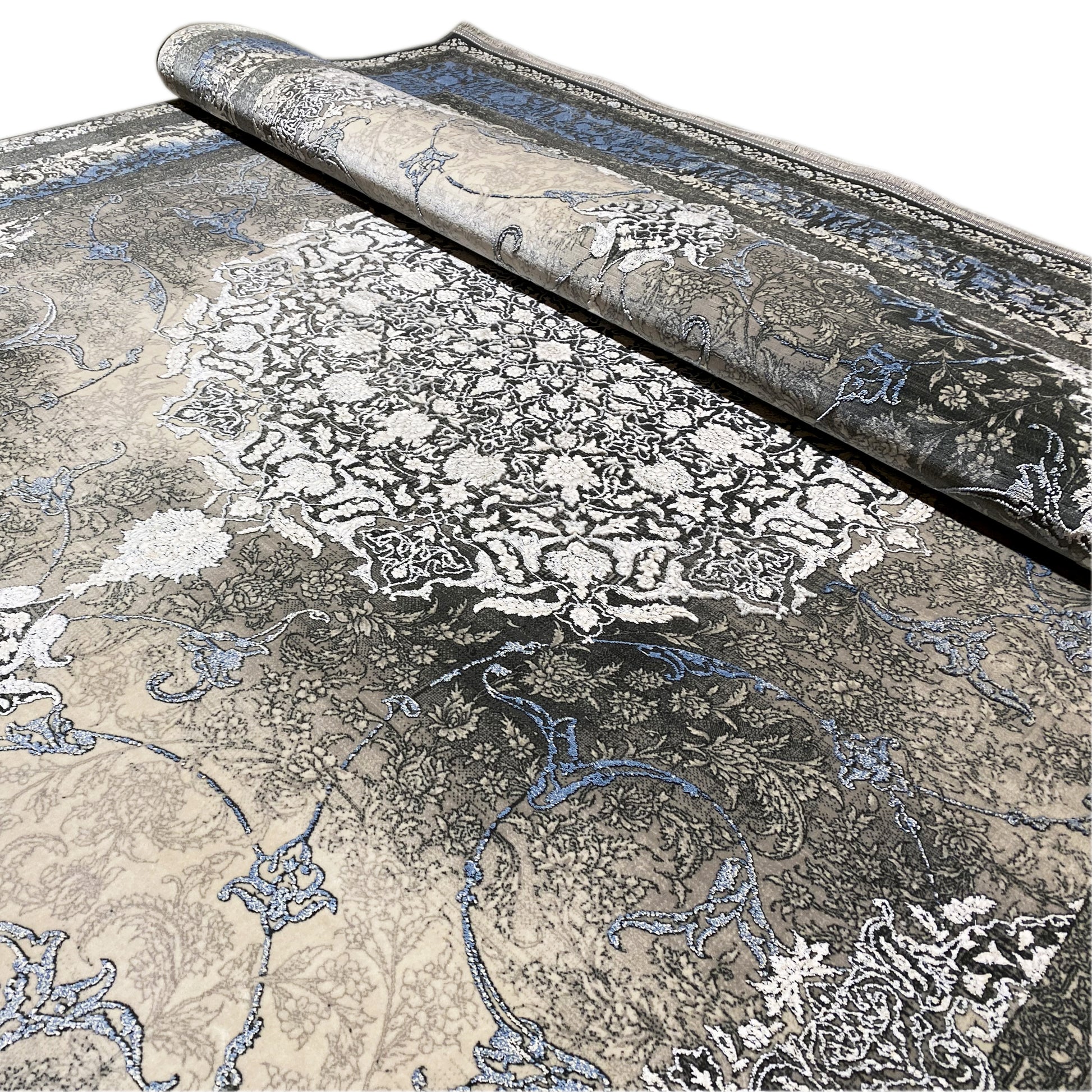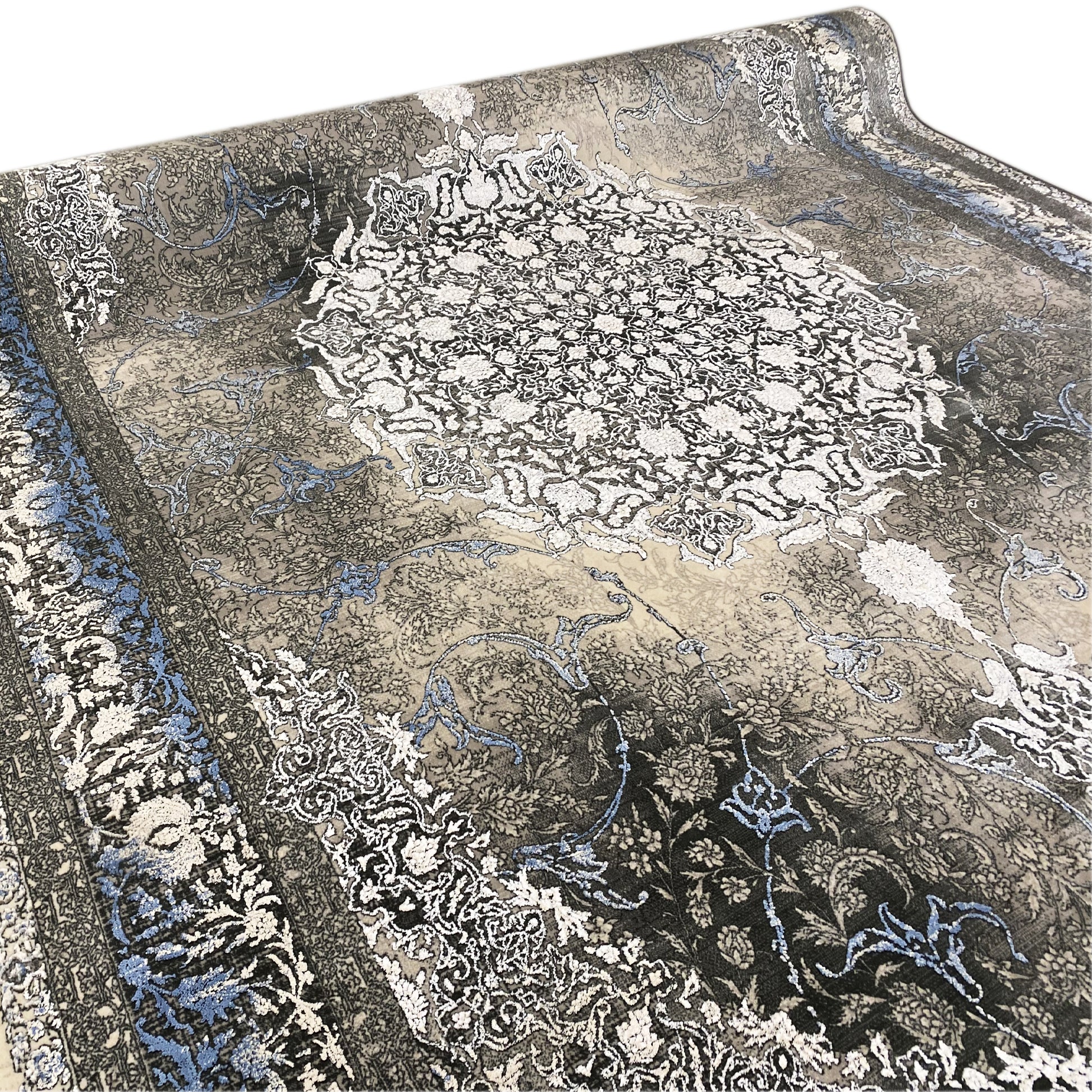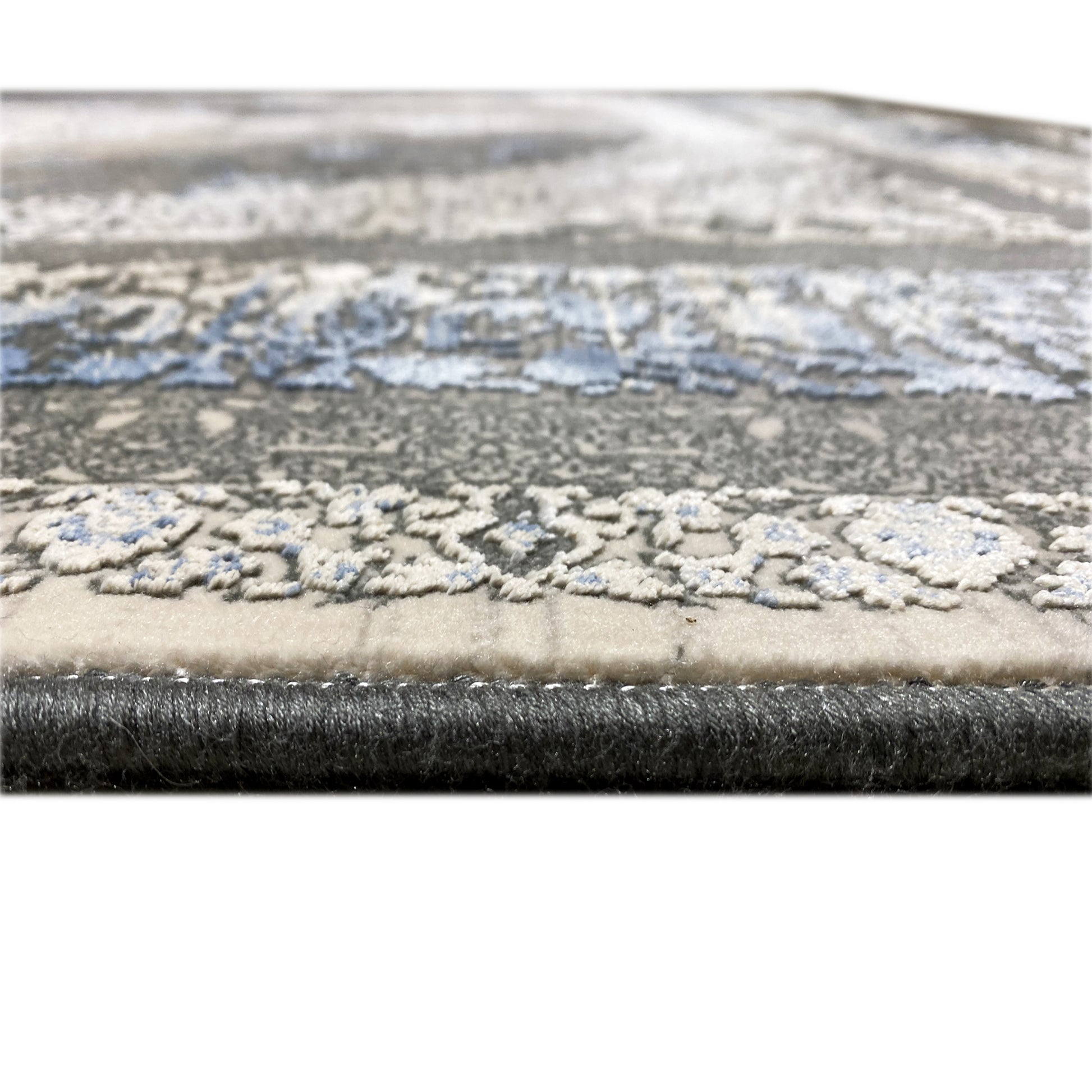Add a touch of timeless elegance to your home with this beautiful classic rug. The artistic central medallion in cream and gray tones stands out against a smoky, subtly faded background framed by a vibrant blue border. Made from 100% heat-treated acrylic, this soft and durable rug is perfect for high-traffic areas, combining luxurious style with modern resilience. The generous size of 170x240cm is ideal for adding an elegant focal point to your living or bedroom.