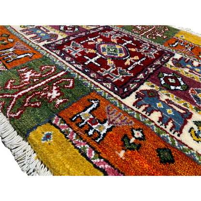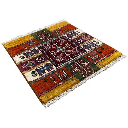 This hand-knotted Gabbeh Lori rug captures the eye with its vibrant and versatile color spectrum. The use of hand-spun wool gives this rug a tangible naturalness and emphasizes the traditional craftsmanship that went into its creation. With its compact dimensions of 58x57 cm, it is perfect for adding a warm and individual touch as a special detail in various areas of your home. The fascinating pattern features stylized depictions of animals such as elephants and horses, artfully embedded in geometric and ornamental decorations that give the rug a unique and appealing aesthetic. Its rustic decorative style blends seamlessly into cozy and nature-inspired interior styles. This sturdy and durable rug is more than just a floor covering; it is an expression of traditional art and adds character and a welcoming atmosphere to your home. The colorful accents and imaginative motifs make it a charming and distinctive element of your decor.