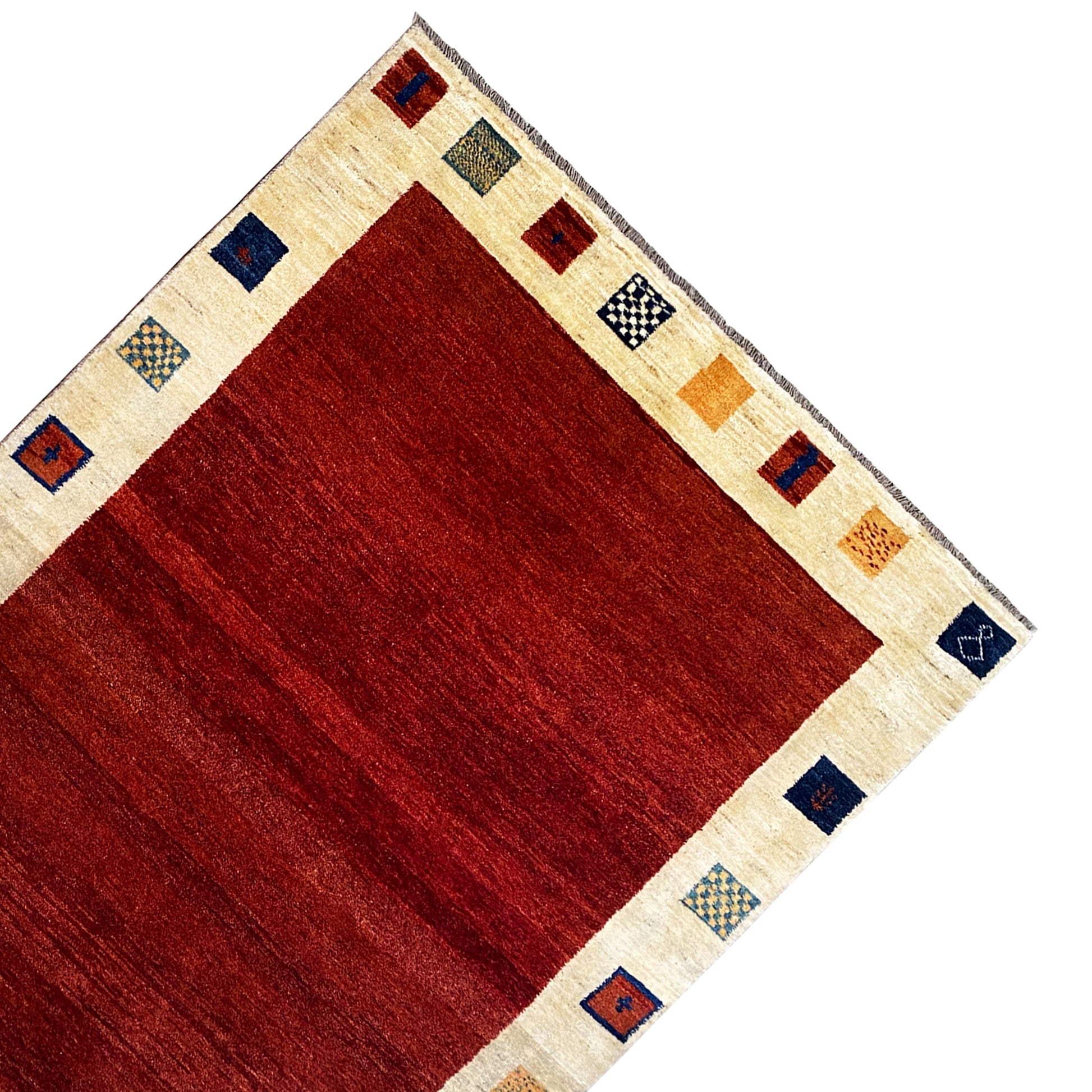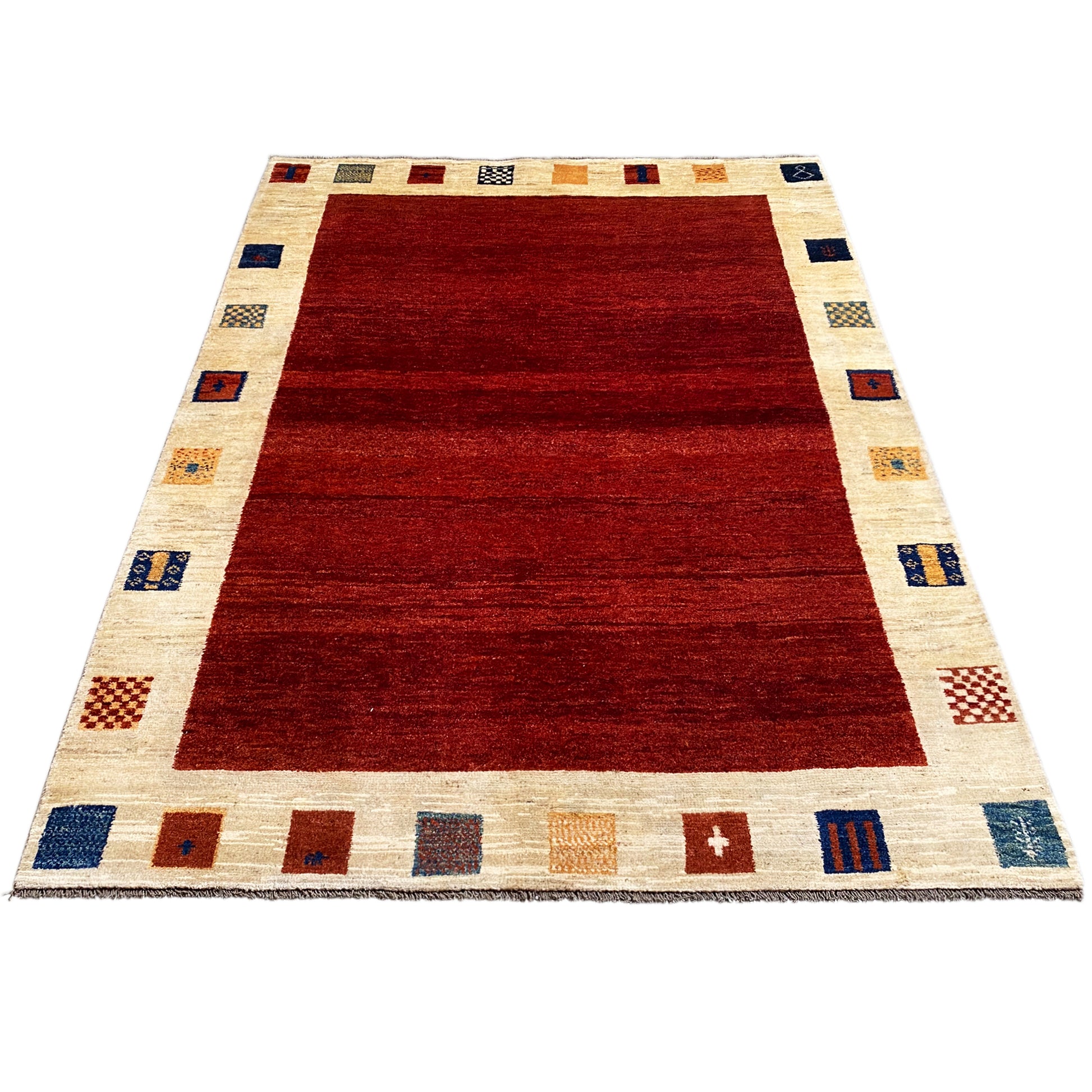 This magnificent, hand-knotted Gabbeh rug, made from hand-spun and plant-dyed wool, impresses with its warm red center, framed by a striking beige border accented with colorful squares. With its generous dimensions of 231x164 cm, it is an ideal statement piece for living or dining areas, bringing an earthy yet vibrant atmosphere to your home. The minimalist yet expressive pattern and high-quality material make it a timeless addition to various interior styles, from rustic to modern.