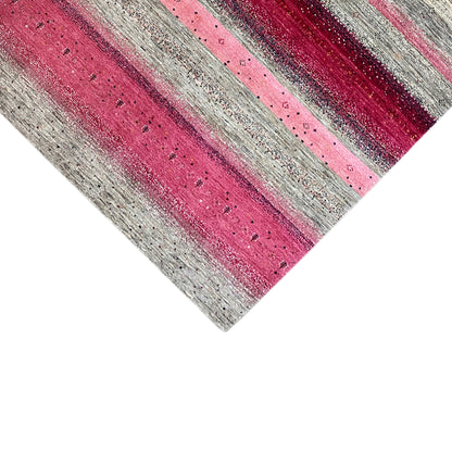 This hand-knotted Gabbeh Exclusive Rug (300x200 cm) features a modern striped pattern in vibrant pink tones and neutral gray shades. Made from hand-spun, plant-dyed wool, it offers a natural texture and color variety. Its stylish design integrates wonderfully into modern interiors and gives any room a warm and inviting atmosphere. The various pink tones, accented by gray and beige, create an elegant focal point. This sturdy and durable rug is ideal for living and sleeping areas and improves the room climate. Unique craftsmanship for a stylish home.