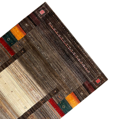 This impressive, hand-knotted Gabbeh Luri Exclusive rug captivates with its sophisticated stripe design in an earthy color palette of brown, beige, gray, red, orange, and green tones. The horizontally running stripes vary in width and color intensity, creating a lively yet harmonious visual rhythm. Subtle traditional patterns and small woven details enrich the design, giving this rug a special depth and authenticity. Made from high-quality, hand-spun wool and dyed with plant-based colors, this rug impresses not only with its exceptional appearance but also with its natural texture and durability. With its generous dimensions of 297x198 cm, it becomes an elegant centerpiece in spacious living areas. The versatile stripe pattern integrates wonderfully into modern, rustic, or ethnically inspired decor styles, lending every room a warm and inviting atmosphere. This rug is not only a high-quality floor covering but also a testament to traditional craftsmanship and natural beauty.