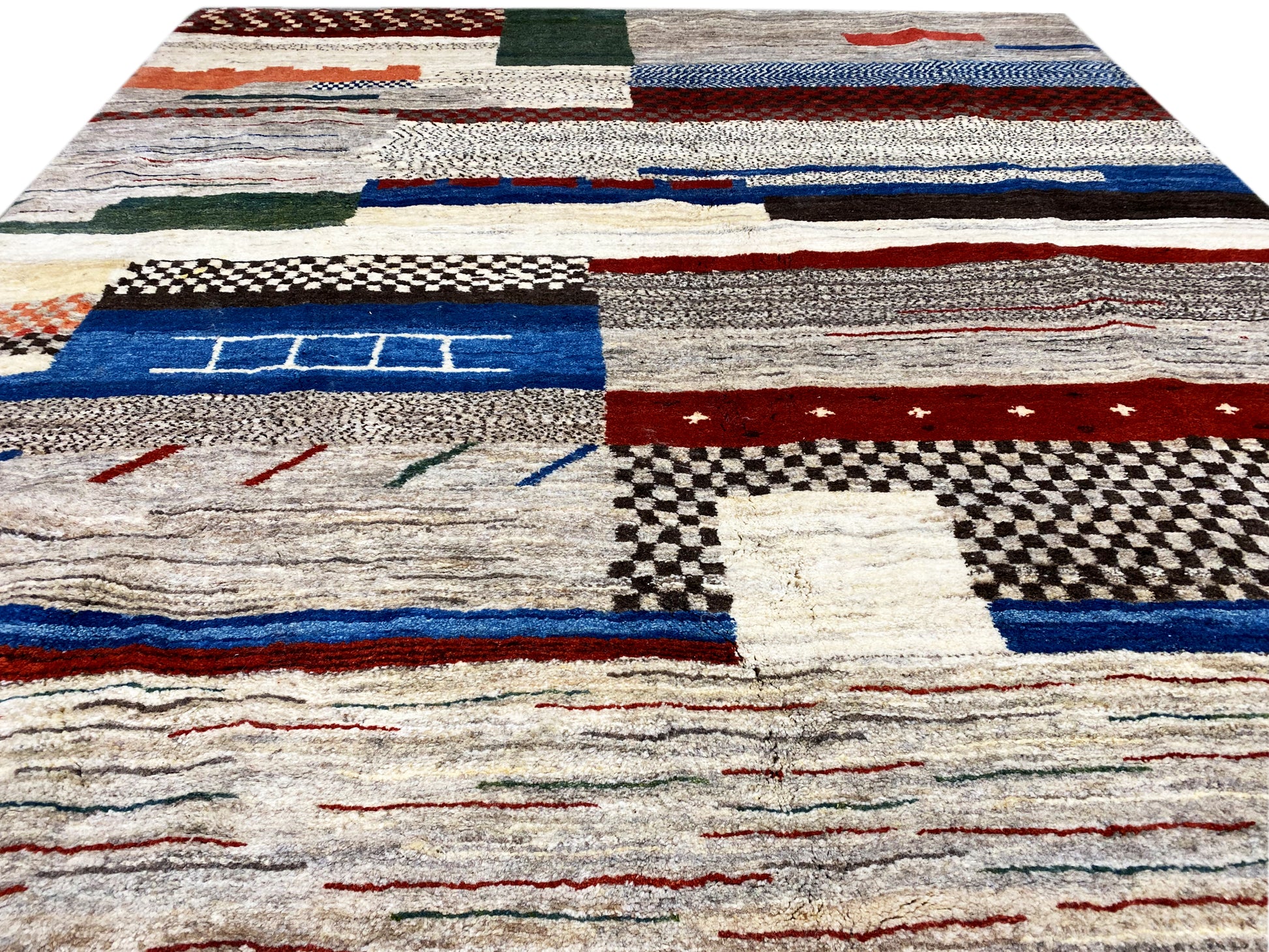 This exclusive Gabbeh rug measuring 291x204 cm impresses with its modern, geometric patchwork design in elegant gray and natural tones, making it ideal for modern and minimalist living styles. Hand-knotted from hand-spun, plant-dyed wool, it stands out for its soft texture, high durability, and natural coloring. The unique pattern gives every room character and creates a stylish, cozy atmosphere in living or sleeping areas.