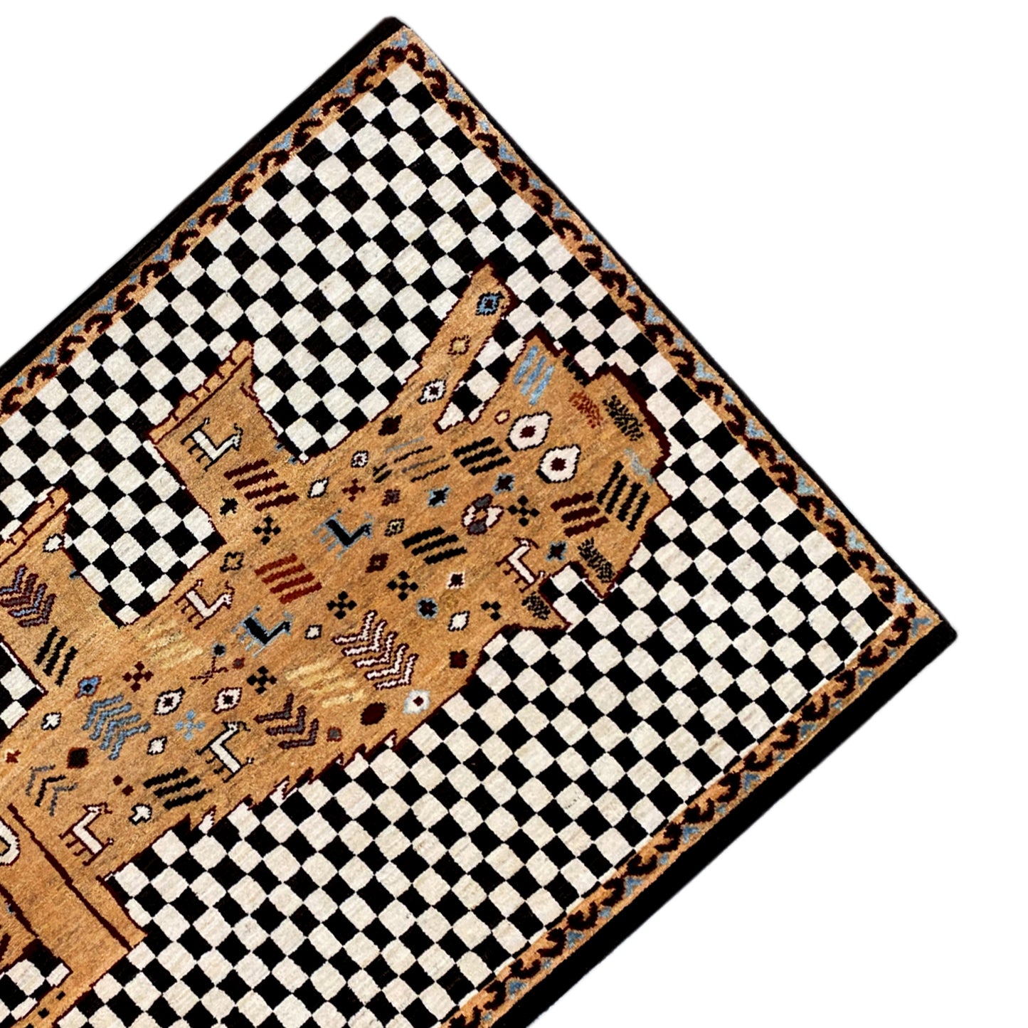 This exceptional, hand-knotted Gabbeh rug features a fascinating and unconventional design that combines traditional elements with modern abstraction. Made from hand-spun, plant-dyed wool of the highest quality, this rug impresses with its unique texture and artistic expression. A central beige field is richly decorated with stylized animal motifs and abstract symbols, surrounded by a contrasting black and white checkerboard pattern. The irregular shape of the central field and the playful details give this rug a very special charm. With its dimensions of 175x120 cm, it is perfect as an original statement piece in modern living spaces or as an inspiring accent in your study. The natural materials ensure a pleasant indoor climate and emphasize the durability of this special wool rug. Bring a touch of individuality, art, and craftsmanship perfection into your home with this unique Gabbeh rug.