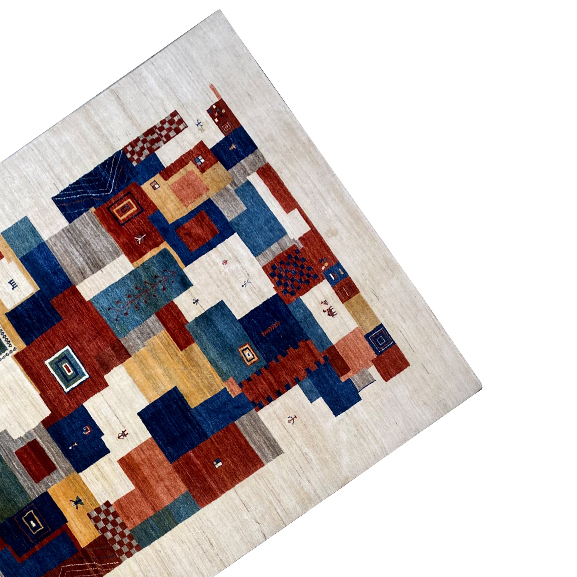This hand-knotted Gabbeh rug (349x245 cm) impresses with its colorful, geometric pattern and brings a modern, artistic touch to your home. Made from high-quality wool, it adds warmth and comfort to any room. Ideal for contemporary and eclectic interior styles, this rug is a real eye-catcher and a cozy highlight.