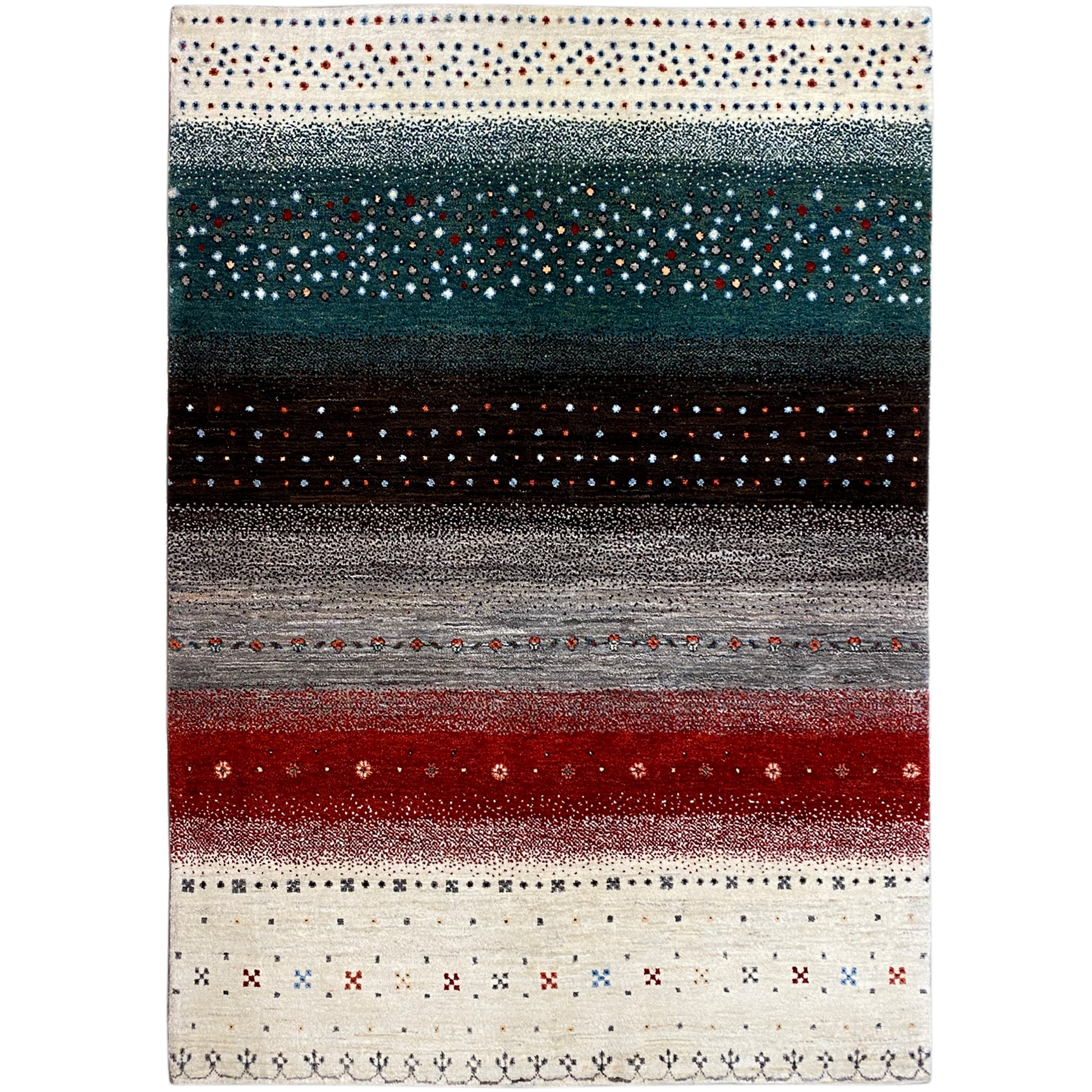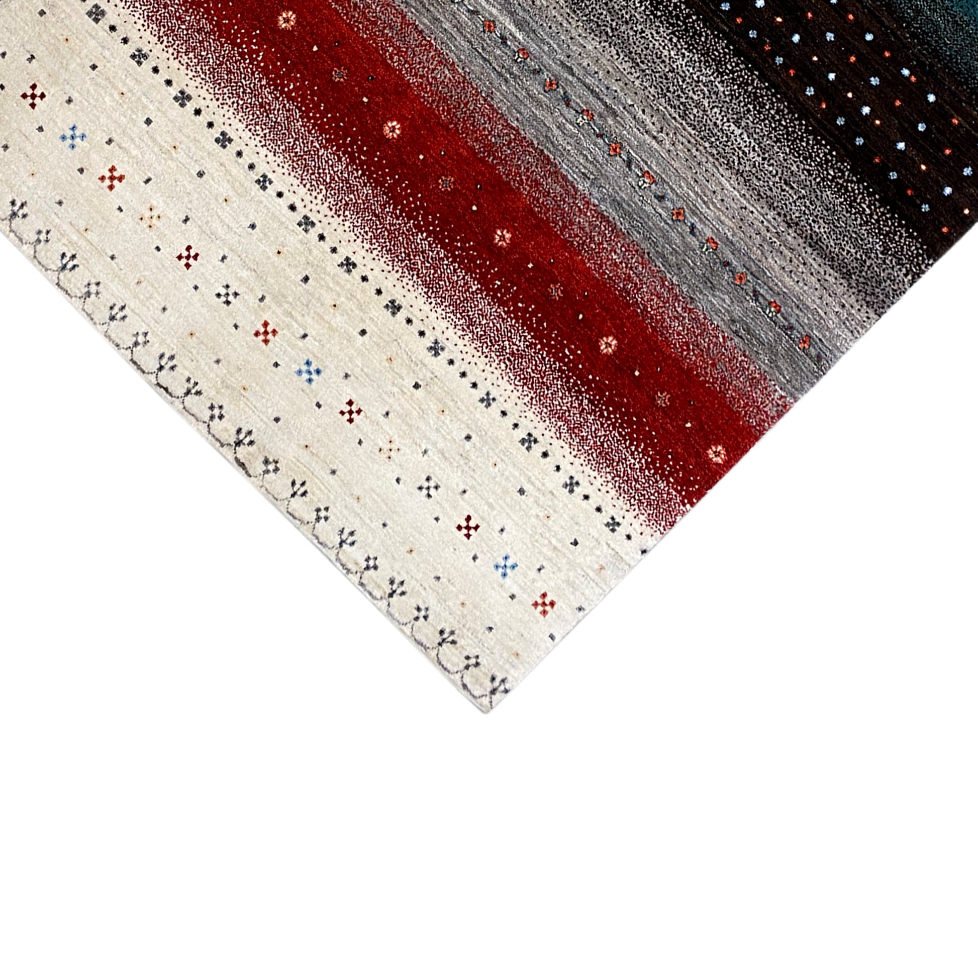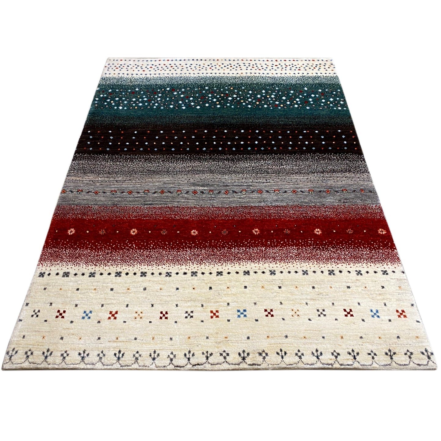 Experience the fascinating variety of colors and high-quality craftsmanship of this hand-knotted Gabbeh Exclusive rug. Made from hand-spun and plant-dyed wool, this rug presents itself in a modern decorative style with an expressive, horizontally striped pattern. The various color zones range from soft beige and gray tones to deep red and brown, as well as vibrant green and dark blue, creating a unique and dynamic design. Subtle scattered patterns and small details within the stripes give the rug additional depth and individual character. With dimensions of 206x148 cm, this rug is perfect for adding an artistic and lively touch to your living space. The natural materials and traditional knotting technique guarantee high quality and durability. This Gabbeh rug is a true masterpiece that impresses with its colorful design and high-quality workmanship, giving your home a special radiance.