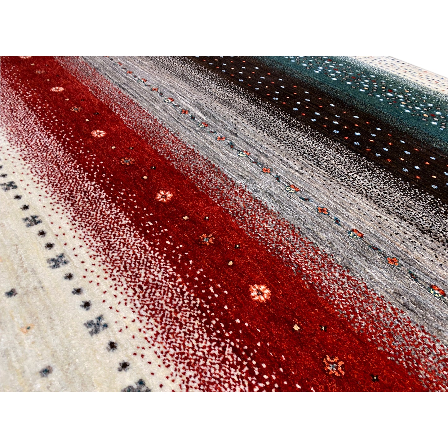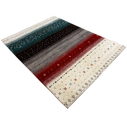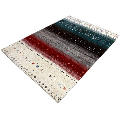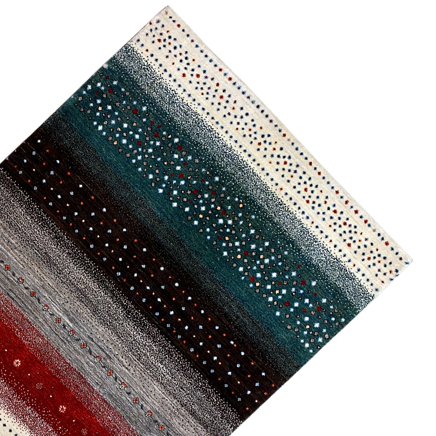 Experience the fascinating variety of colors and high-quality craftsmanship of this hand-knotted Gabbeh Exclusive rug. Made from hand-spun and plant-dyed wool, this rug presents itself in a modern decorative style with an expressive, horizontally striped pattern. The various color zones range from soft beige and gray tones to deep red and brown, as well as vibrant green and dark blue, creating a unique and dynamic design. Subtle scattered patterns and small details within the stripes give the rug additional depth and individual character. With dimensions of 206x148 cm, this rug is perfect for adding an artistic and lively touch to your living space. The natural materials and traditional knotting technique guarantee high quality and durability. This Gabbeh rug is a true masterpiece that impresses with its colorful design and high-quality workmanship, giving your home a special radiance.