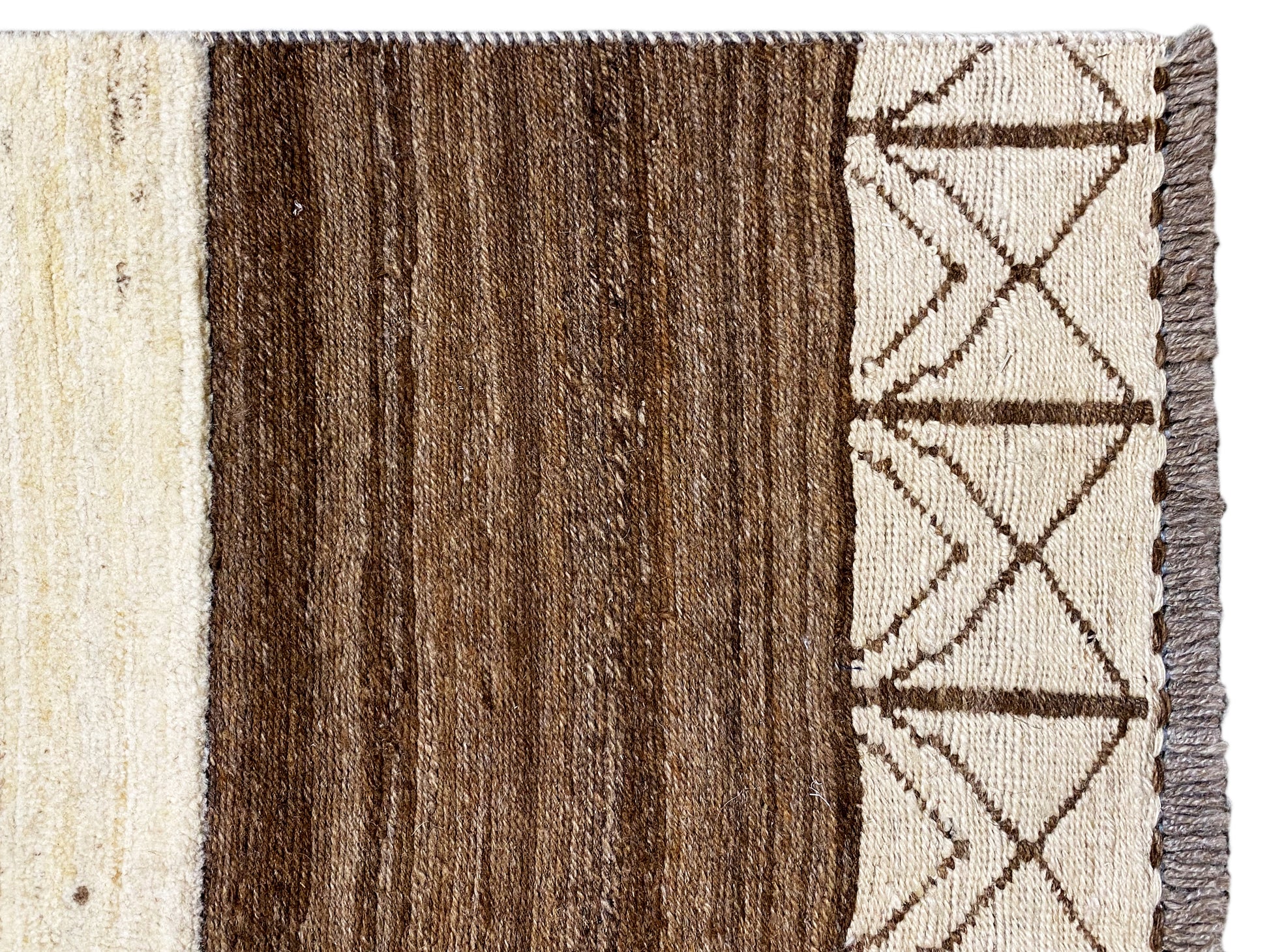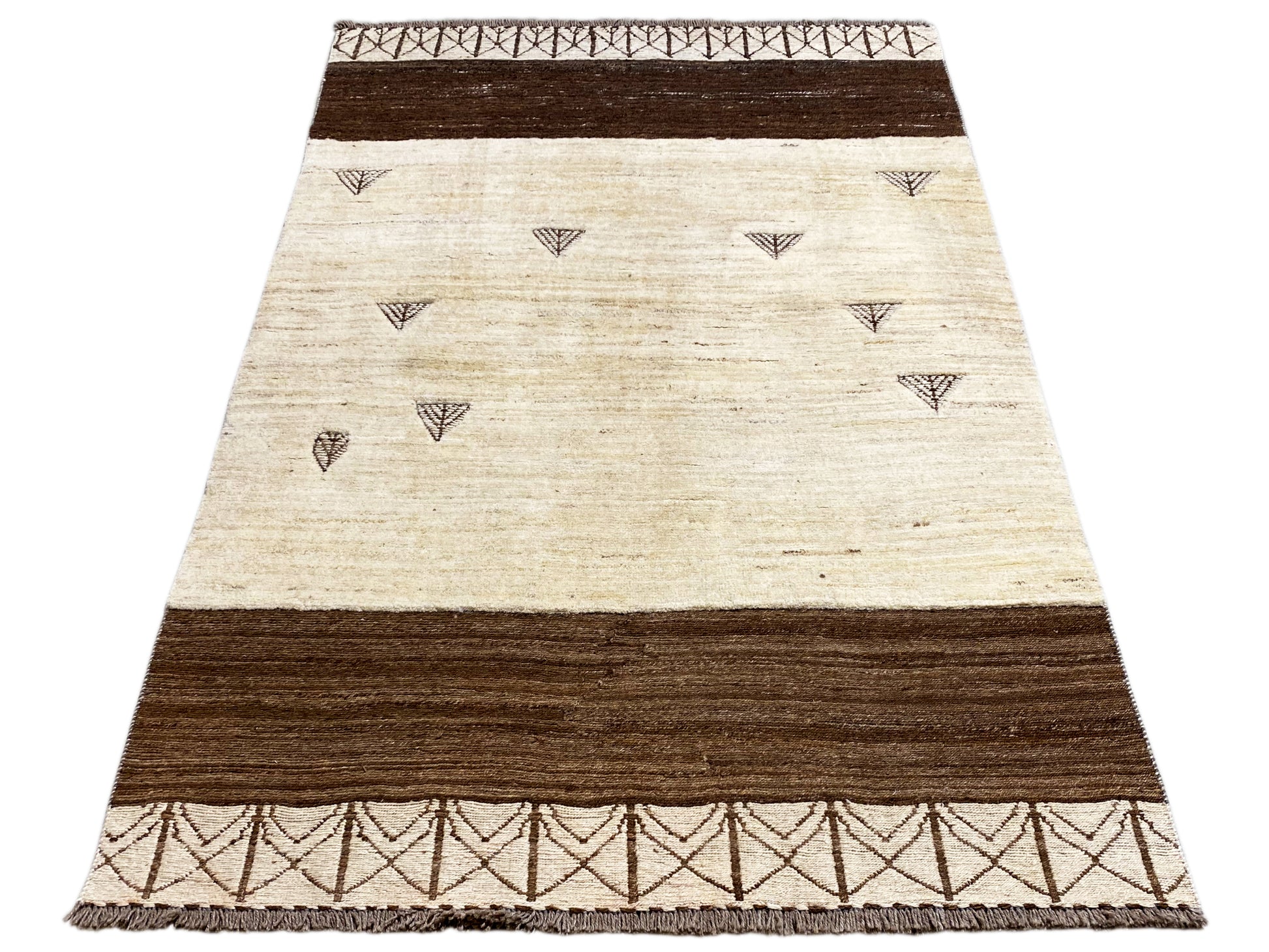 This handwoven Kilim Gabbeh rug made from 100% hand-spun wool combines a warm beige base with striking brown borders and subtle geometric tribal motifs. Measuring 185x123 cm, it is ideal for living and sleeping areas and perfectly complements modern, boho, and minimalist interior styles. The simple pattern with small symbolic elements gives the rug a calm, stylish appearance, while the high-quality wool ensures durability, resilience, and a pleasantly soft feel underfoot – perfect for an elegant and cozy atmosphere.