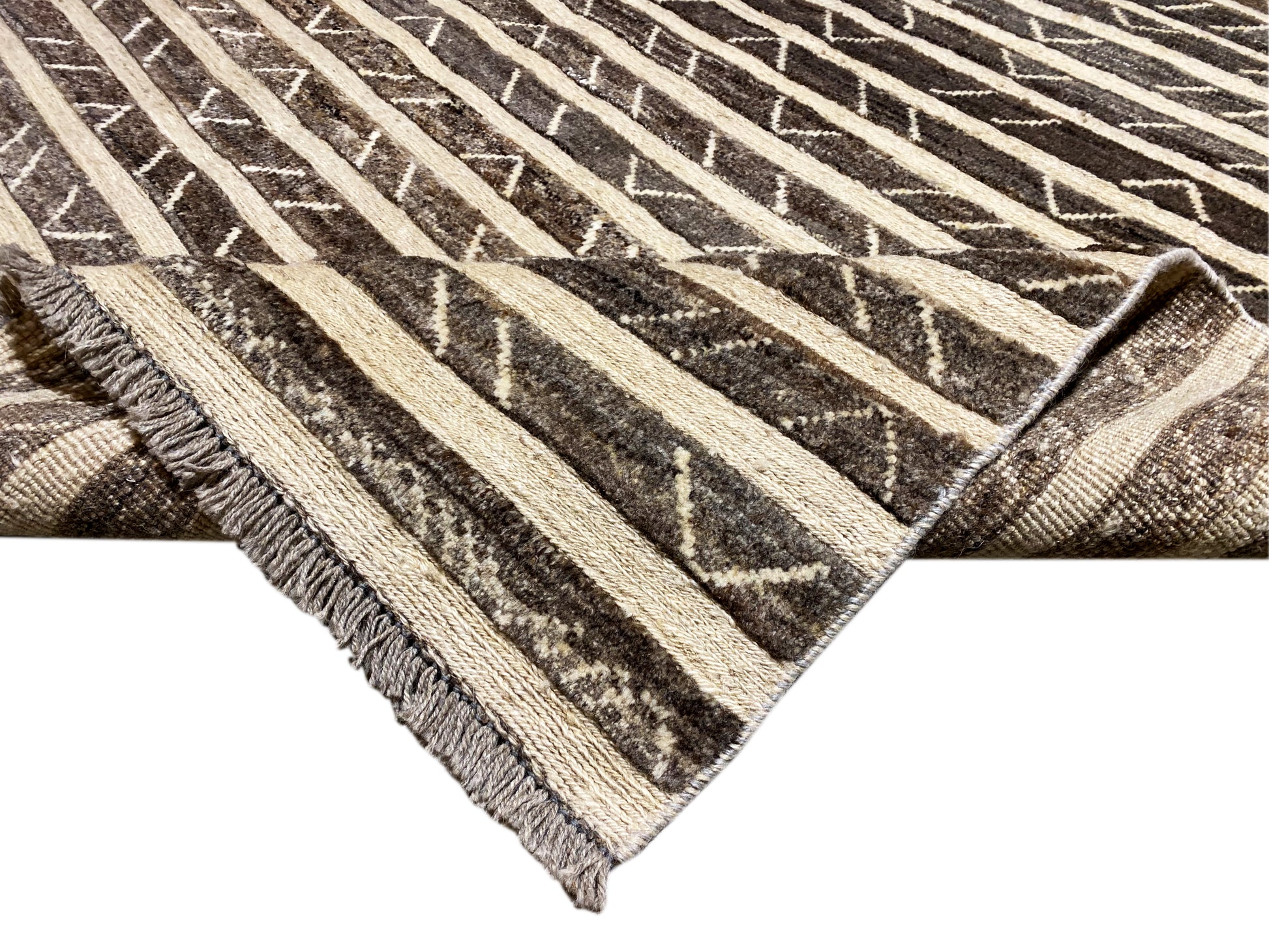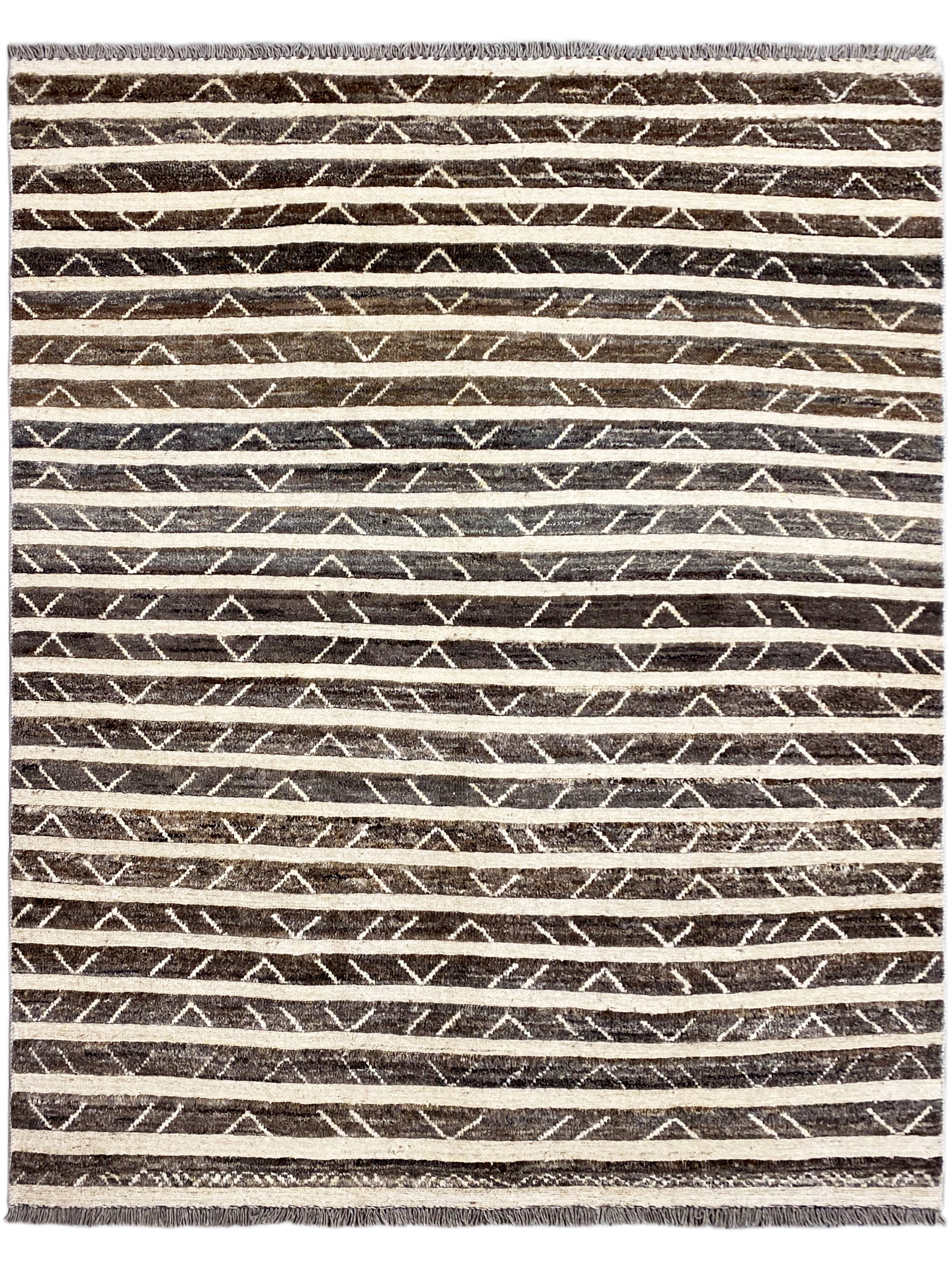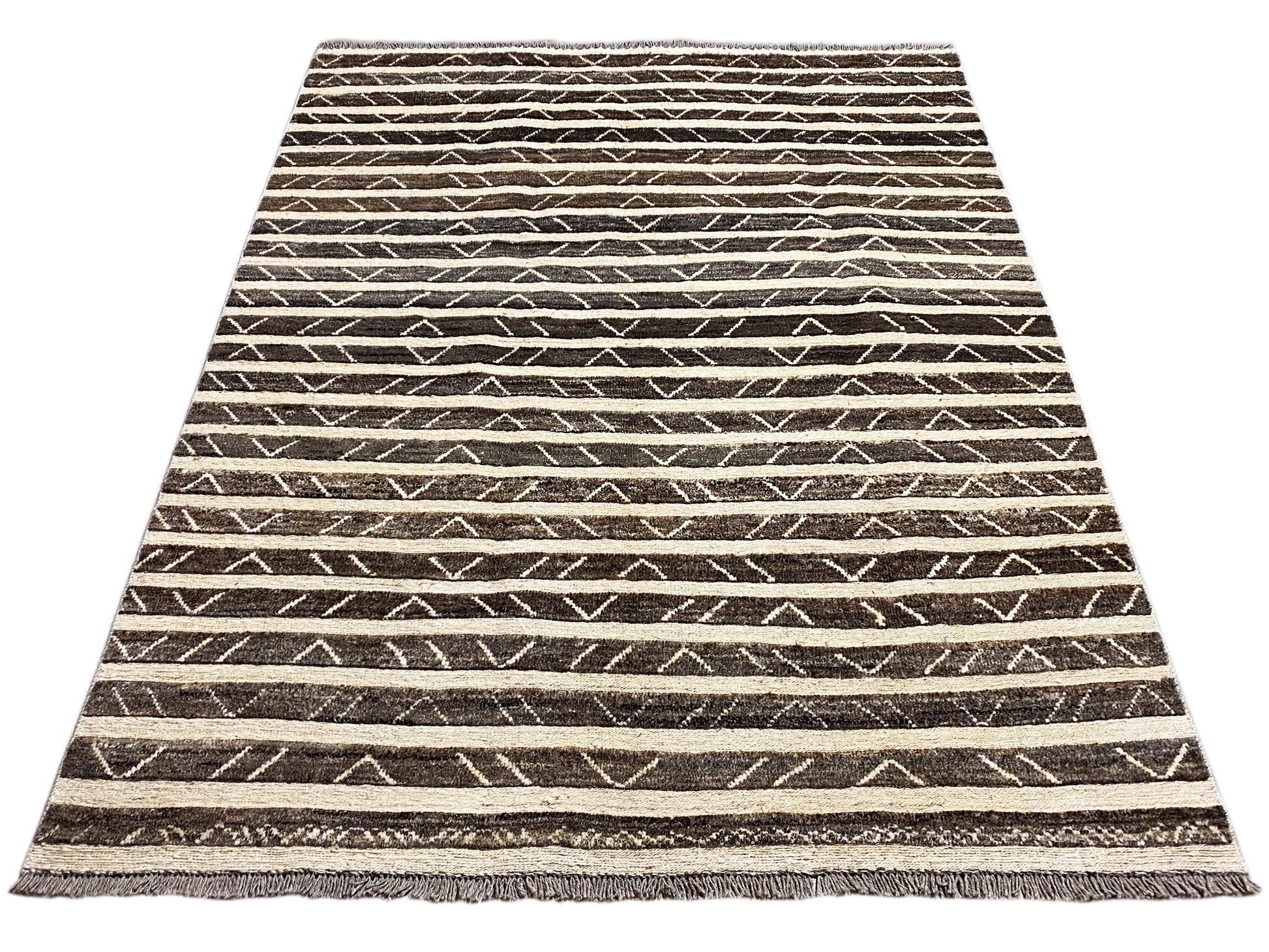 This handwoven Kilim Gabbeh rug made from 100% hand-spun wool impresses with its warm brown color palette and fine geometric stripes, giving any room a modern yet cozy atmosphere. Measuring 193x150 cm, it is ideal for living rooms or dining areas and fits perfectly with modern, boho, and rustic interior styles. The distinctive striped pattern with subtle tribal elements adds visual depth, while the high-quality craftsmanship ensures durability, resilience, and a pleasantly soft feel underfoot – perfect for stylish and comfortable living.