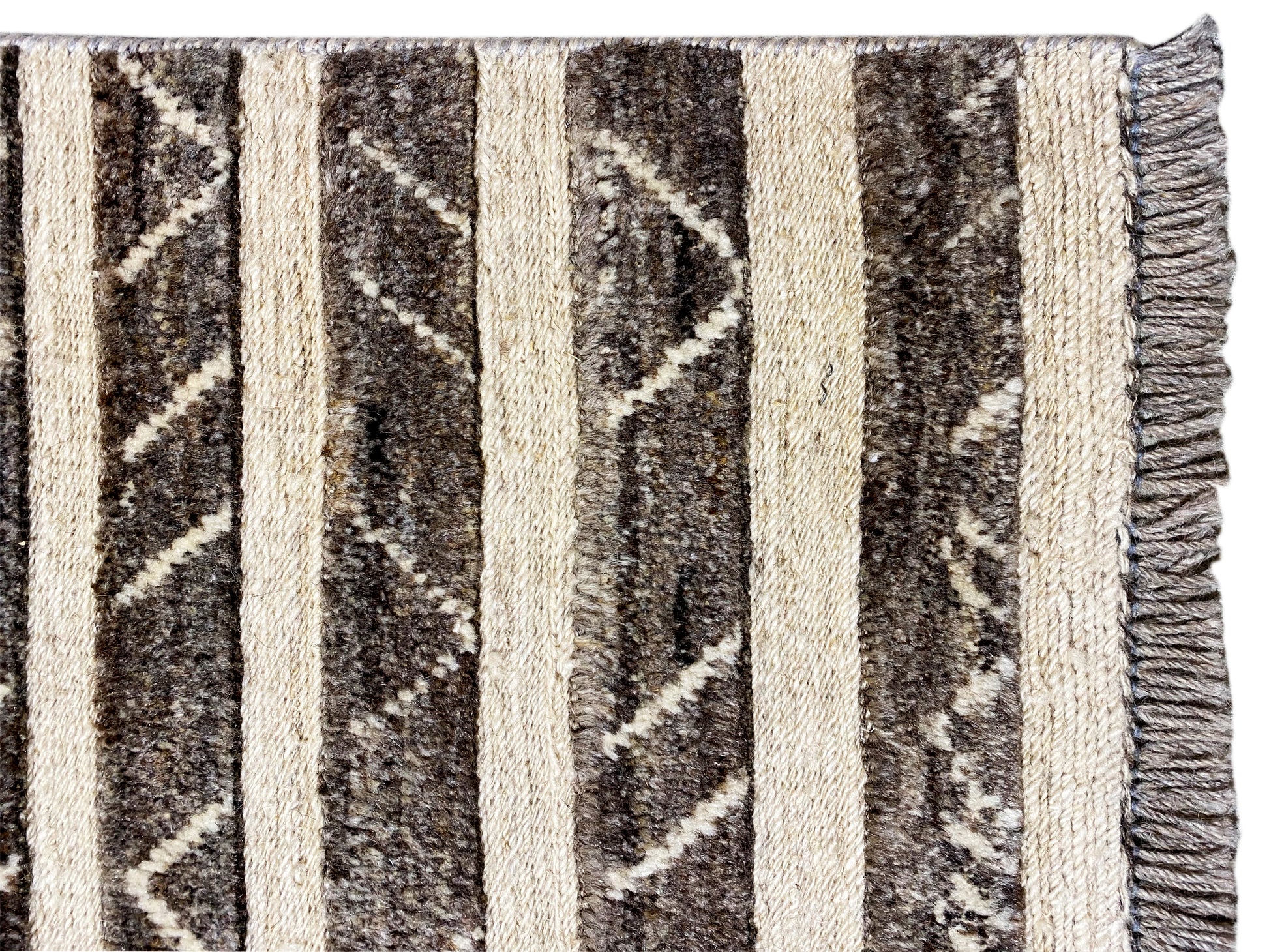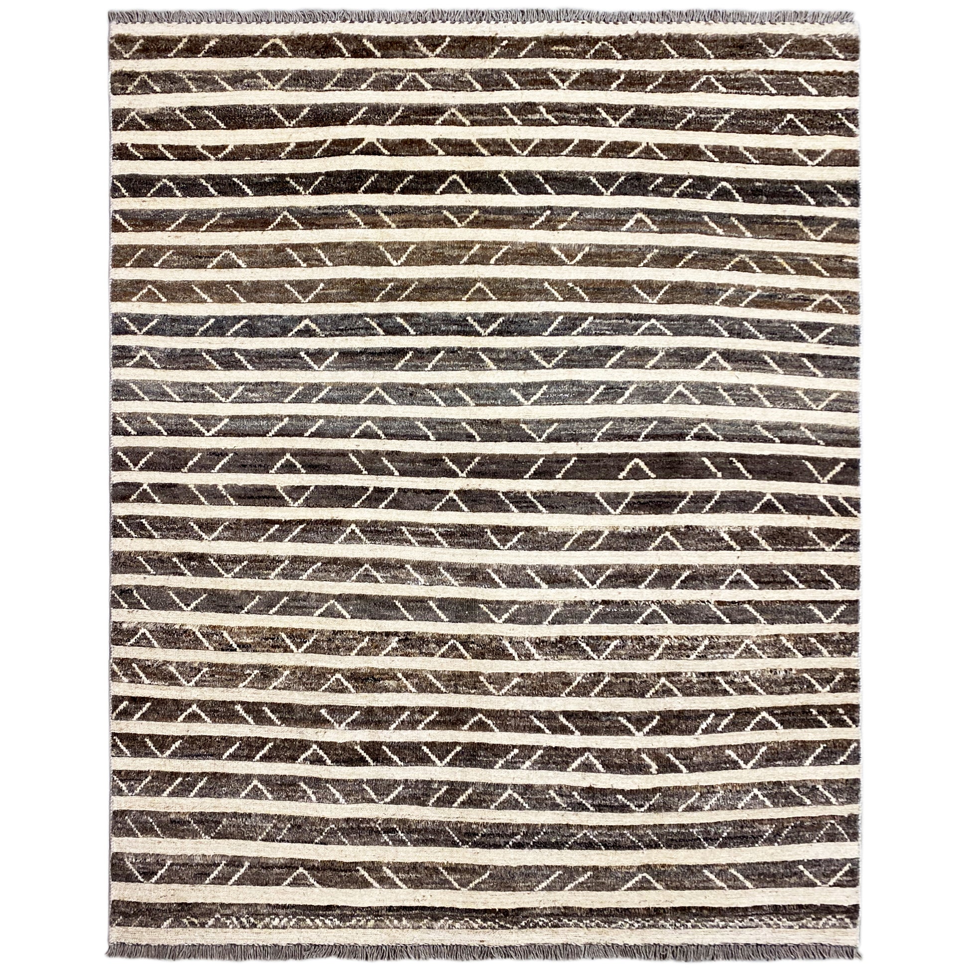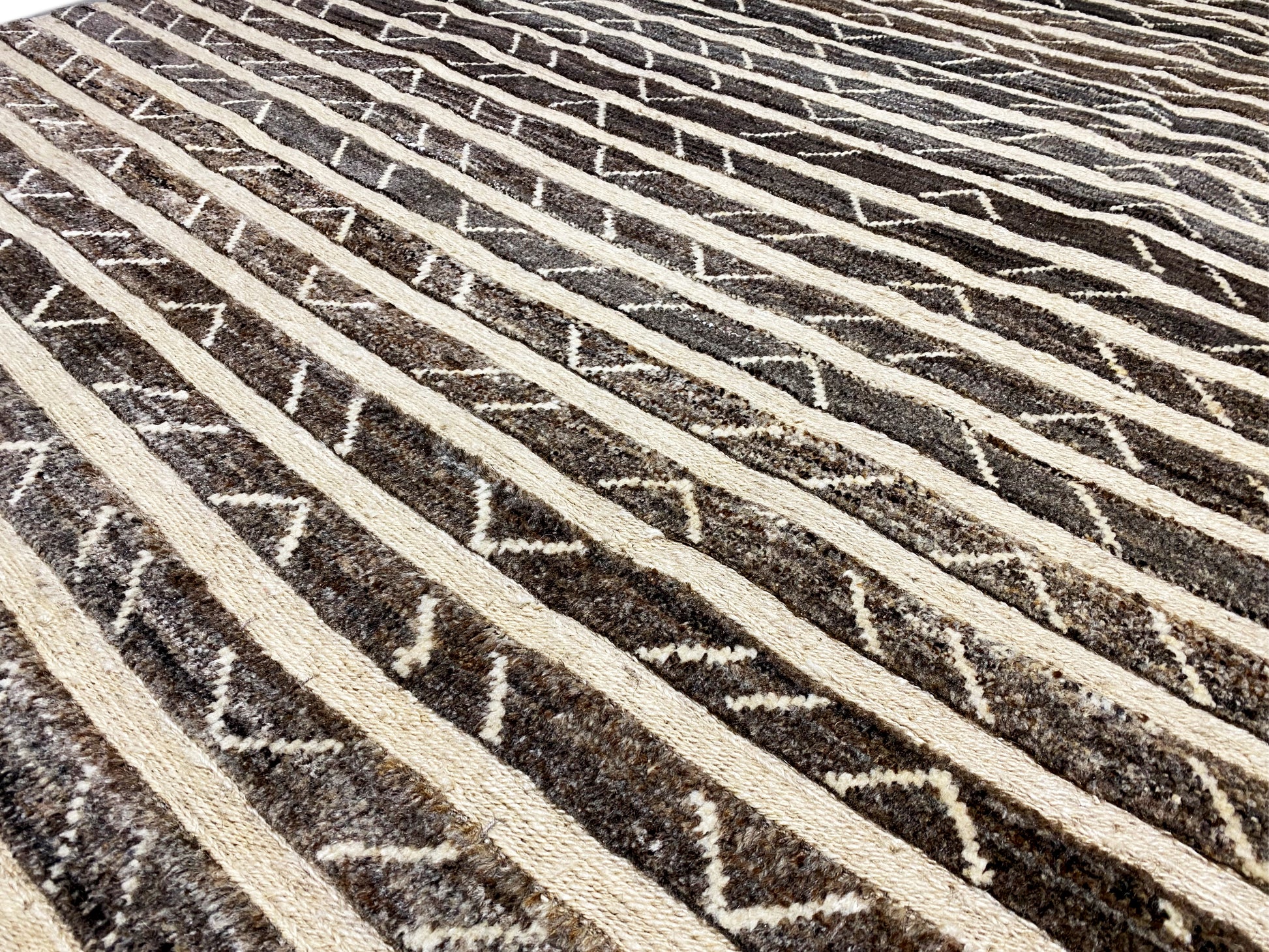This handwoven Kilim Gabbeh rug made from 100% hand-spun wool impresses with its warm brown color palette and fine geometric stripes, giving any room a modern yet cozy atmosphere. Measuring 193x150 cm, it is ideal for living rooms or dining areas and fits perfectly with modern, boho, and rustic interior styles. The distinctive striped pattern with subtle tribal elements adds visual depth, while the high-quality craftsmanship ensures durability, resilience, and a pleasantly soft feel underfoot – perfect for stylish and comfortable living.