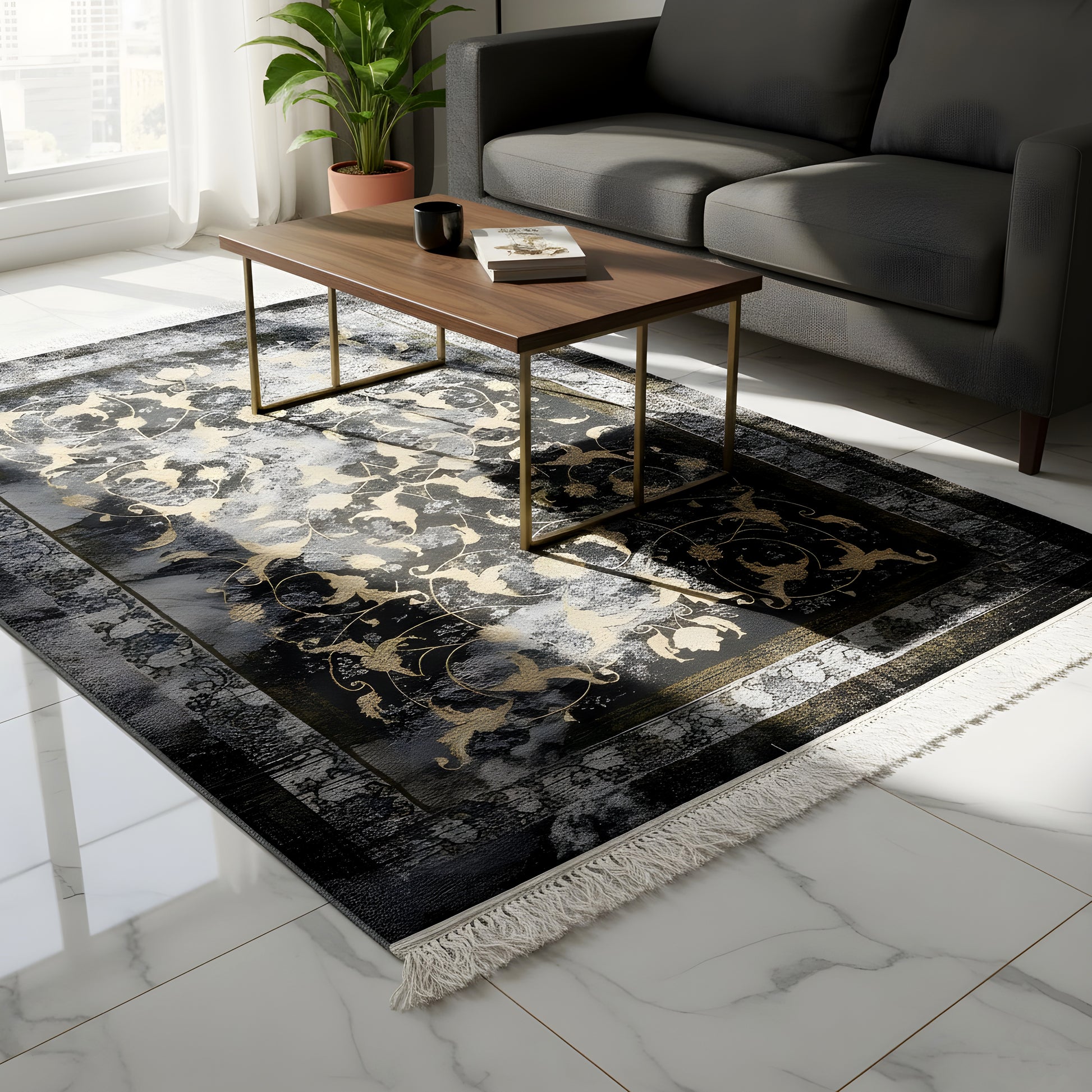 Add a touch of elegance to your home with our woven rug "Kenza". With its stylish vintage design and modern accents in gold and black, this rug harmoniously fits into any decor. Made from 100% polypropylene, it is not only easy to care for and durable but also ideal for high-traffic areas. The floral pattern in noble gold tones on a dark background gives the 160x230cm rug a luxurious appearance. Experience comfort and style, perfectly suited for your living room or bedroom.