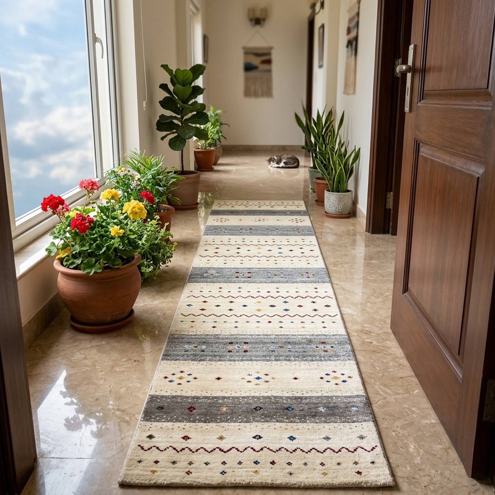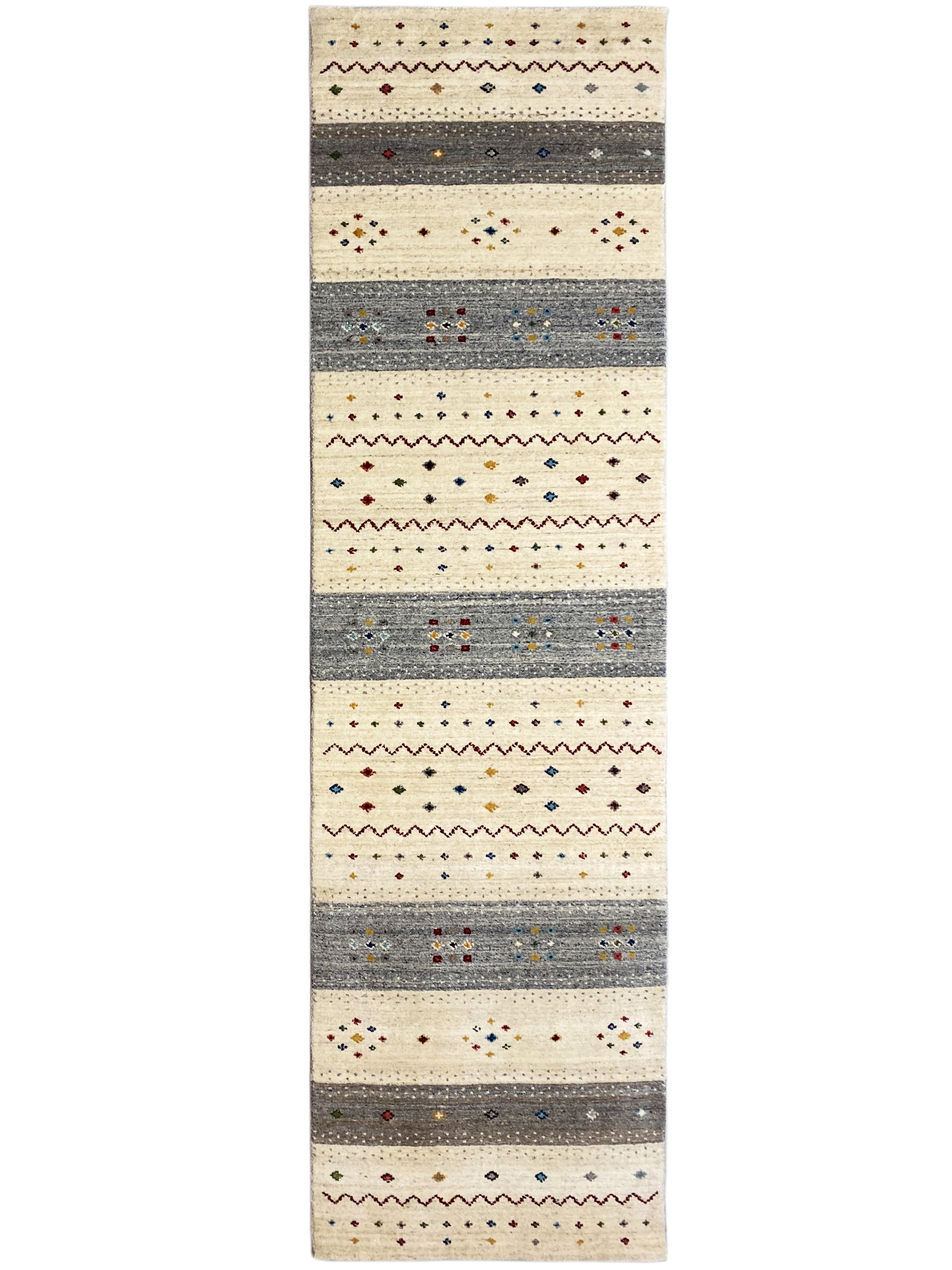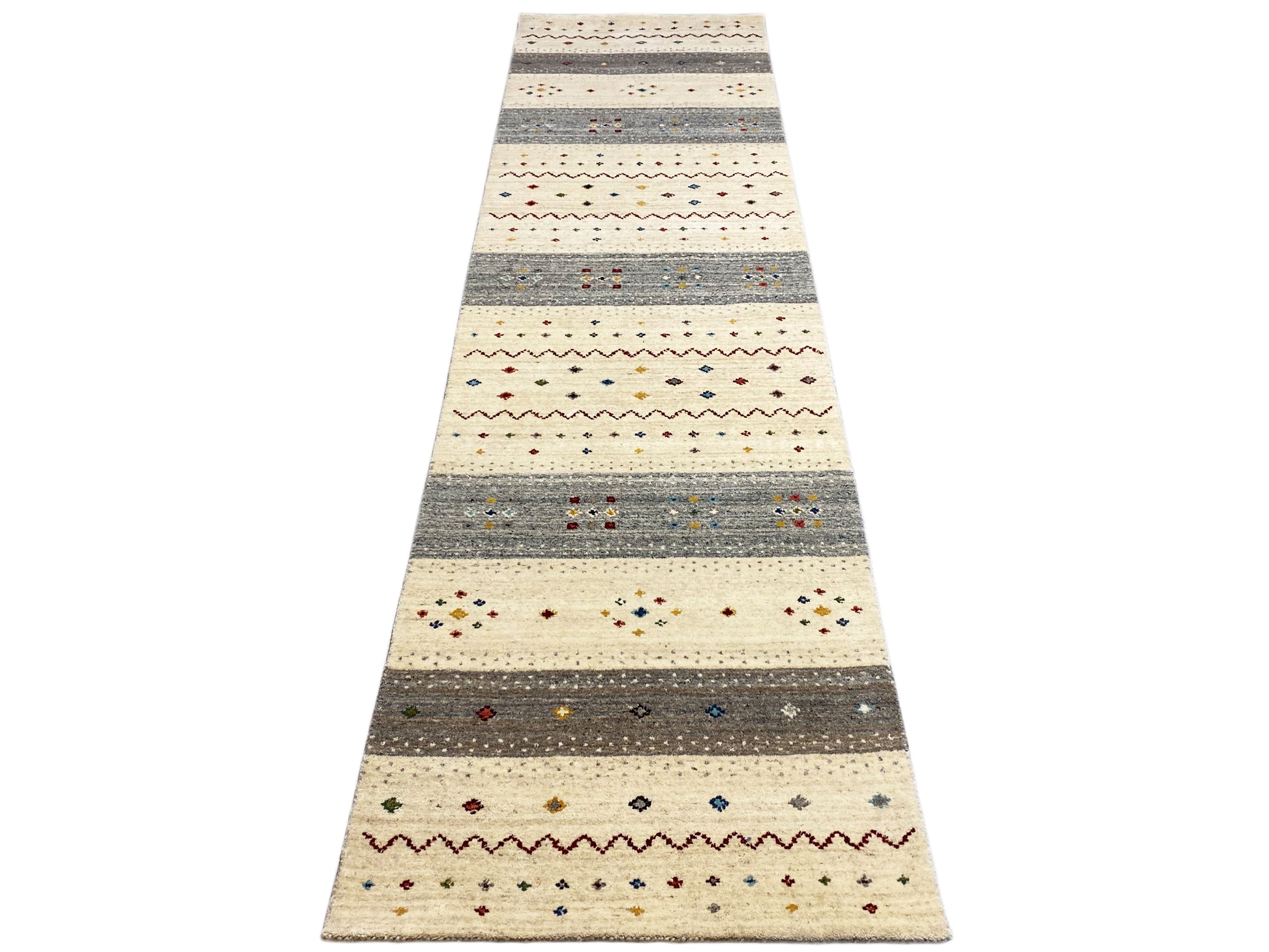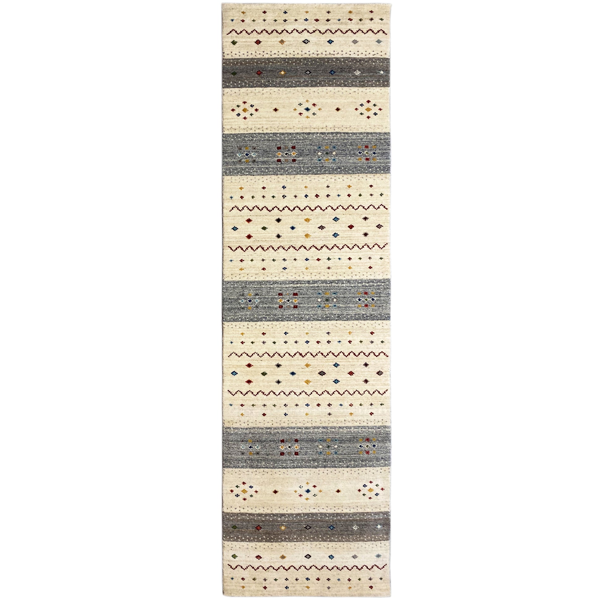 Dieser handgewebfte Loom Luri Teppich aus hochwertiger Wolle verbindet traditionelle Handwerkskunst mit einem modernen, zeitlosen Design. Die harmonische Kombination aus Beige und Grau passt perfekt zu skandinavischen und modernen Einrichtungsstilen und sorgt für eine ruhige, elegante Atmosphäre. Das gestreifte, geometrisch-ethnische Muster mit feinen, farbigen Akzenten verleiht dem Läufer eine stilvolle und lebendige Ausstrahlung. Mit seiner Größe von 80x300 cm eignet er sich ideal für Flure oder lange Räume und bietet gleichzeitig Komfort, Strapazierfähigkeit und natürliche Wärme für den Alltag.