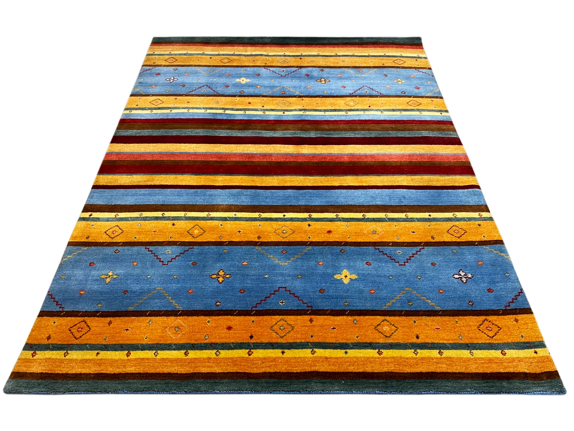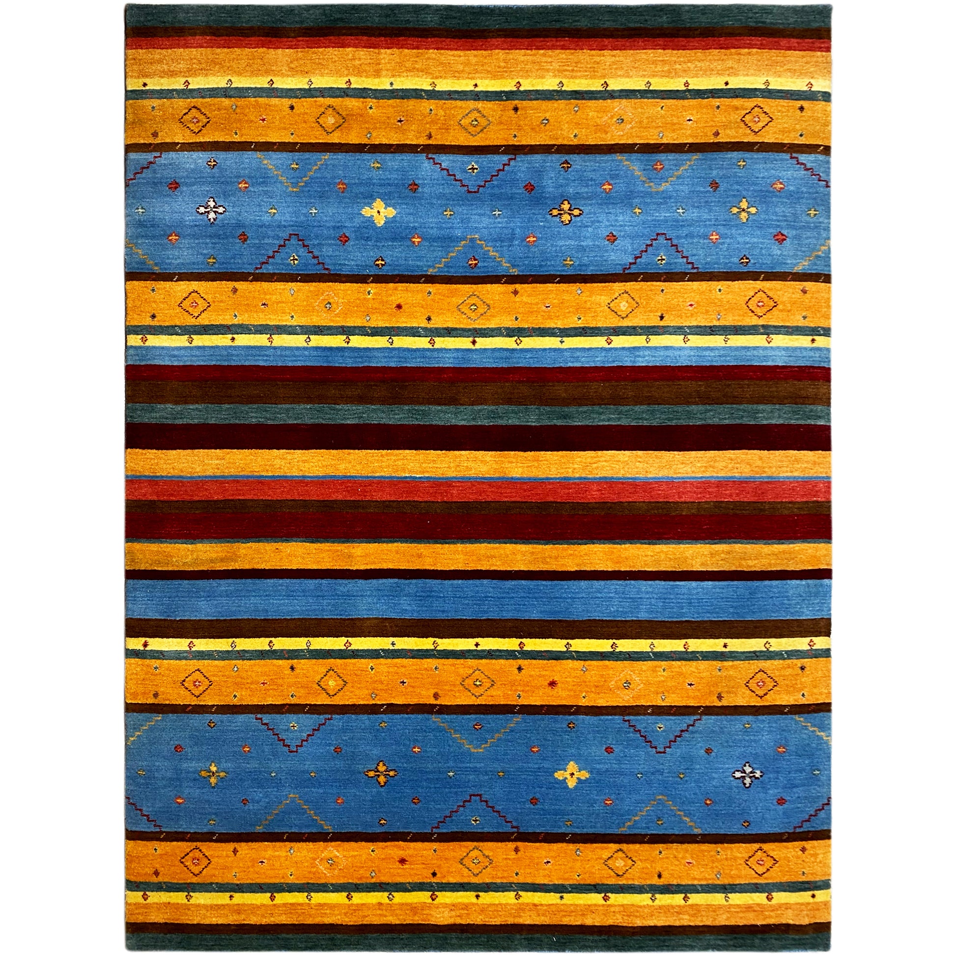 Dieser handgewebte Loom Luri Teppich in 239x173 cm beeindruckt mit seinem lebendigen Streifenmuster und traditionellen geometrischen Motiven in kräftigen Blau-, Rot- und Gelbtönen und passt perfekt zu modernen sowie bohemian Wohnstilen. Gefertigt aus hochwertiger Wolle bietet er eine angenehme Haptik, hohe Strapazierfähigkeit und langlebige Farbintensität. Das charaktervolle Design bringt Wärme und Persönlichkeit in jeden Wohn- oder Schlafbereich und setzt stilvolle Akzente.