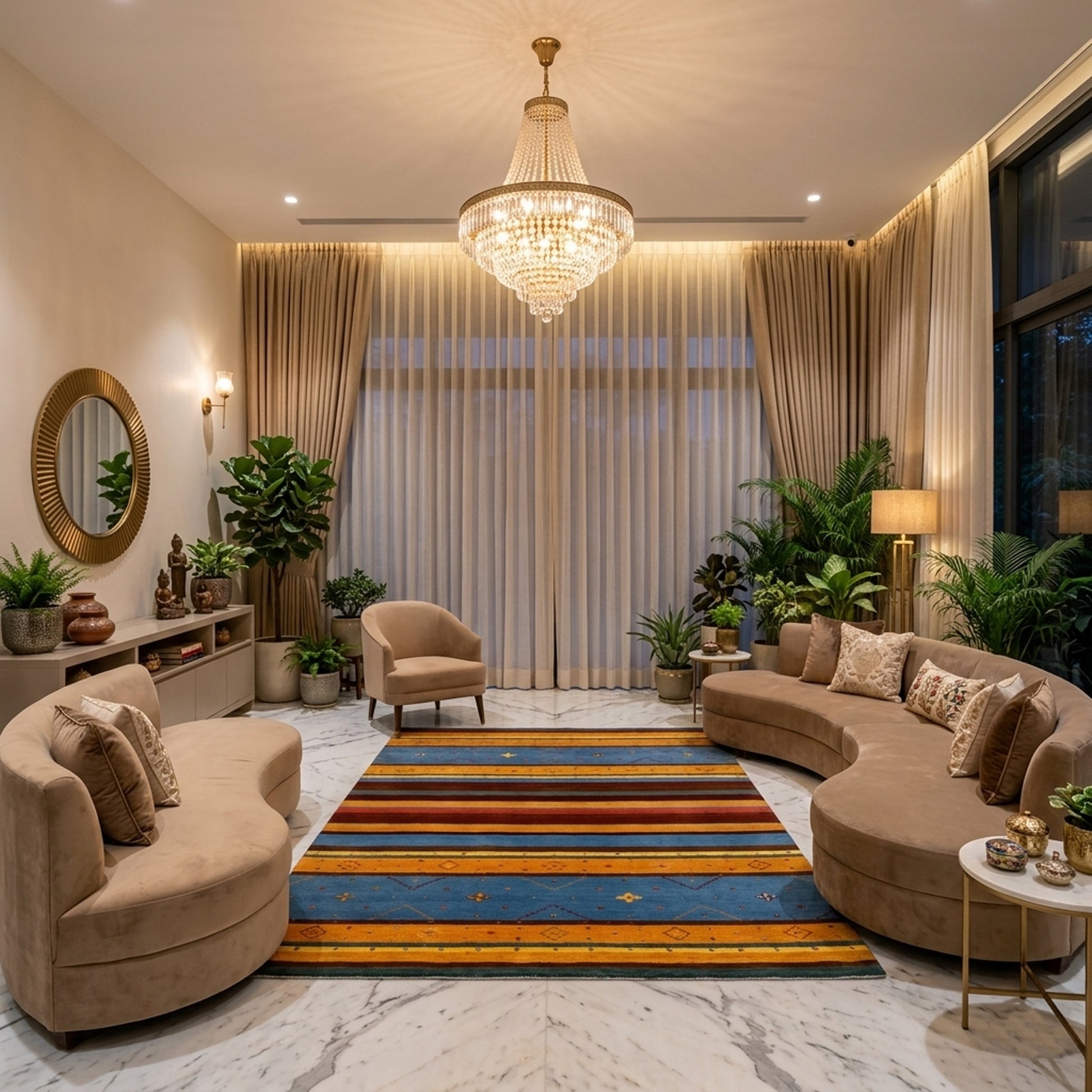 Hinweis: Transportbedingte Falten, wie Sie teilweise auf den Abbildungen zu sehen sind, legen sich innerhalb von wenigen Tagen nach Auslage des Teppichs.