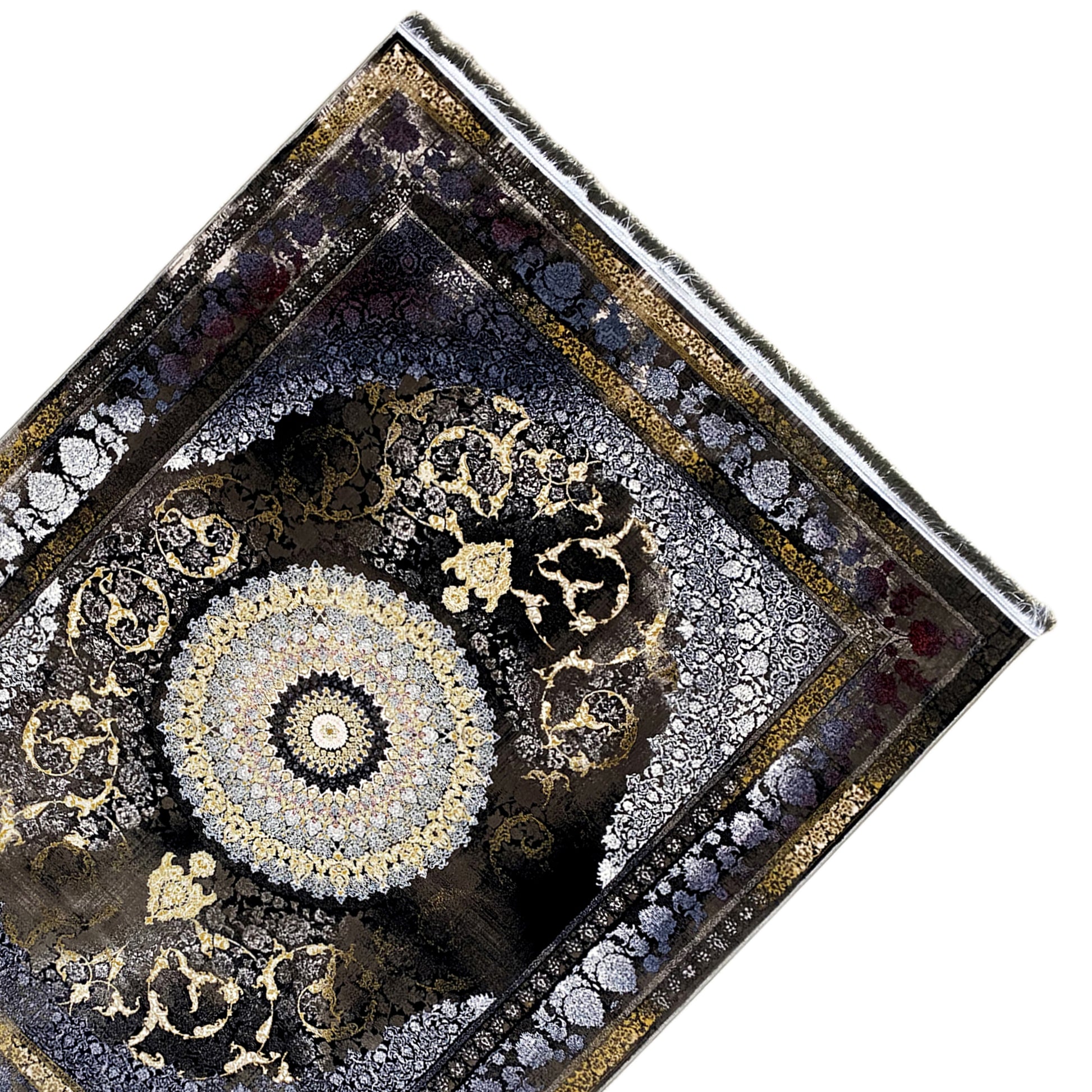 Give your home dramatic elegance with this beautiful modern classic rug. Its striking circular medallion in gold tones stands out against a smoky, faded background, creating a luxurious, timeless look. Made from 100% heat-treated acrylic, this soft and durable rug is perfect for high-traffic areas, combining exquisite style with modern resilience. The generous size of 170x240cm is ideal for adding a refined focal point to your living or bedroom.
