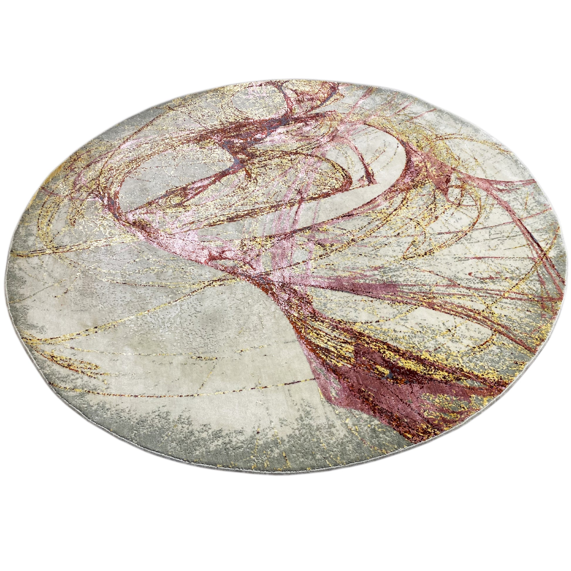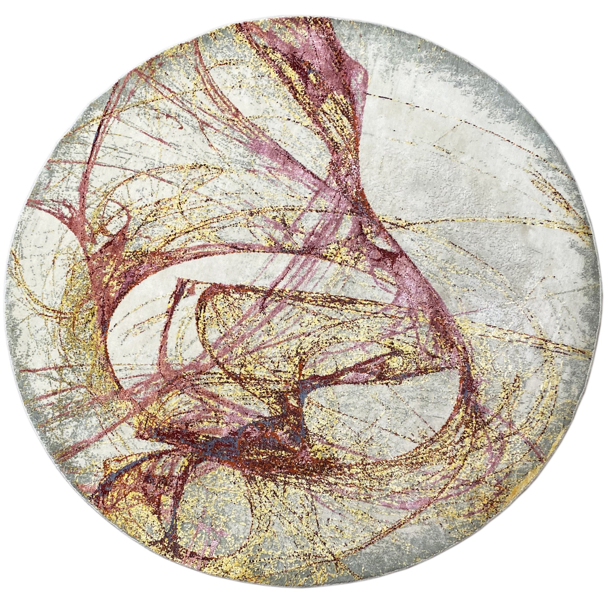 This hand-knotted, round rug made from a blend of hand-spun wool and viscose is a modern artwork for your floor. The abstract pattern in rose and gold on a beige background adds a luxurious yet playful accent to your room. Measuring 202x202 cm, it is a stylish addition to living or bedrooms, creating a warm, inviting atmosphere.