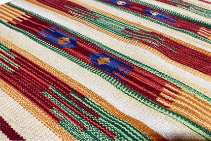 Indian Kilim rugs can feature both modern and traditional design elements. Cotton is mainly used as the material. The rugs are woven flat, which gives them their unique appearance.