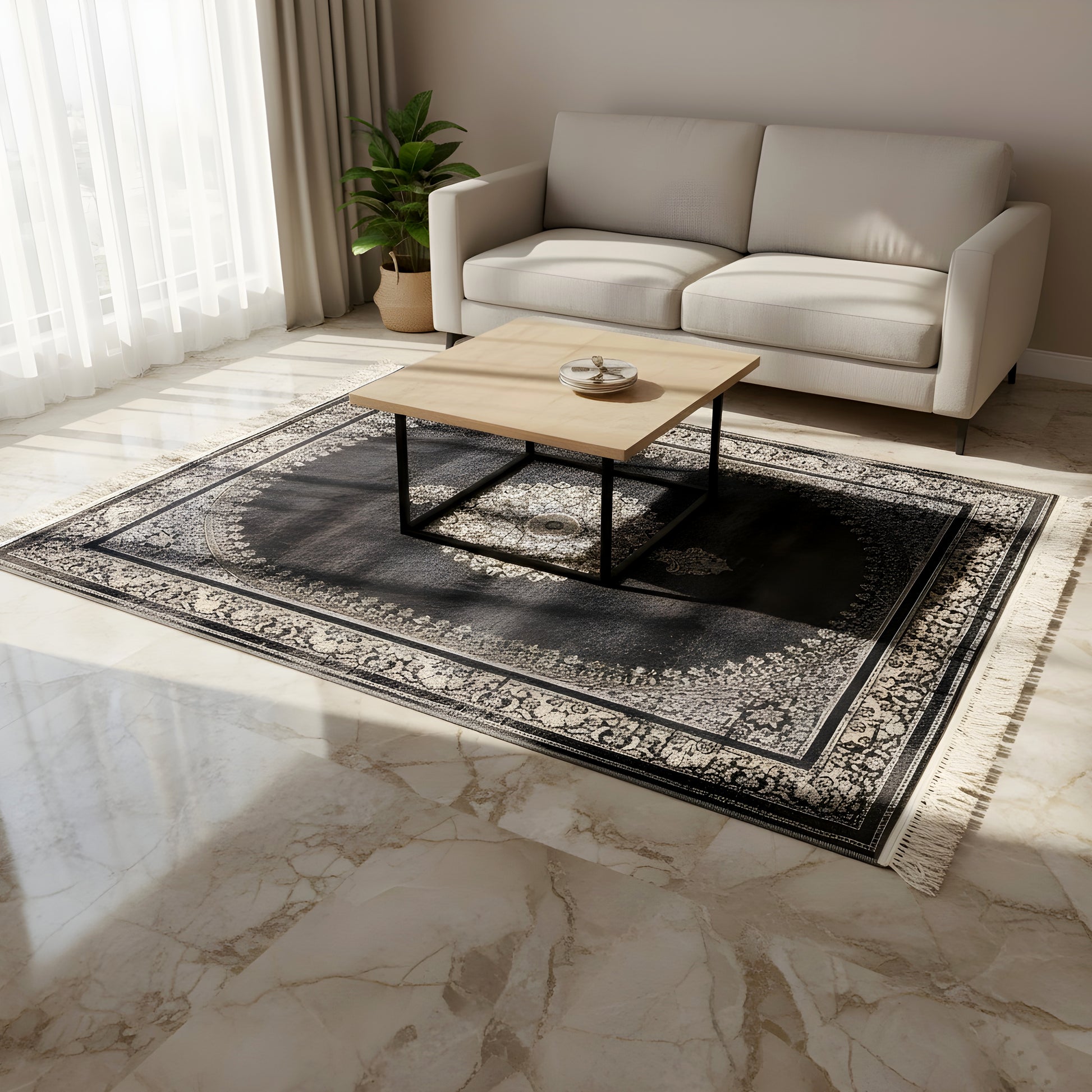 Machine-woven polypropylene carpet in classic oriental design with a centered medallion, dark oval field, and floral border in black, gray, beige, and white. The size 160x230 cm offers a soft feel, high durability, and easy care for living rooms, dining rooms, and bedrooms. The timeless pattern adds elegant accents and complements both traditional and modern interiors, ideal for stylish living spaces with lasting comfort.