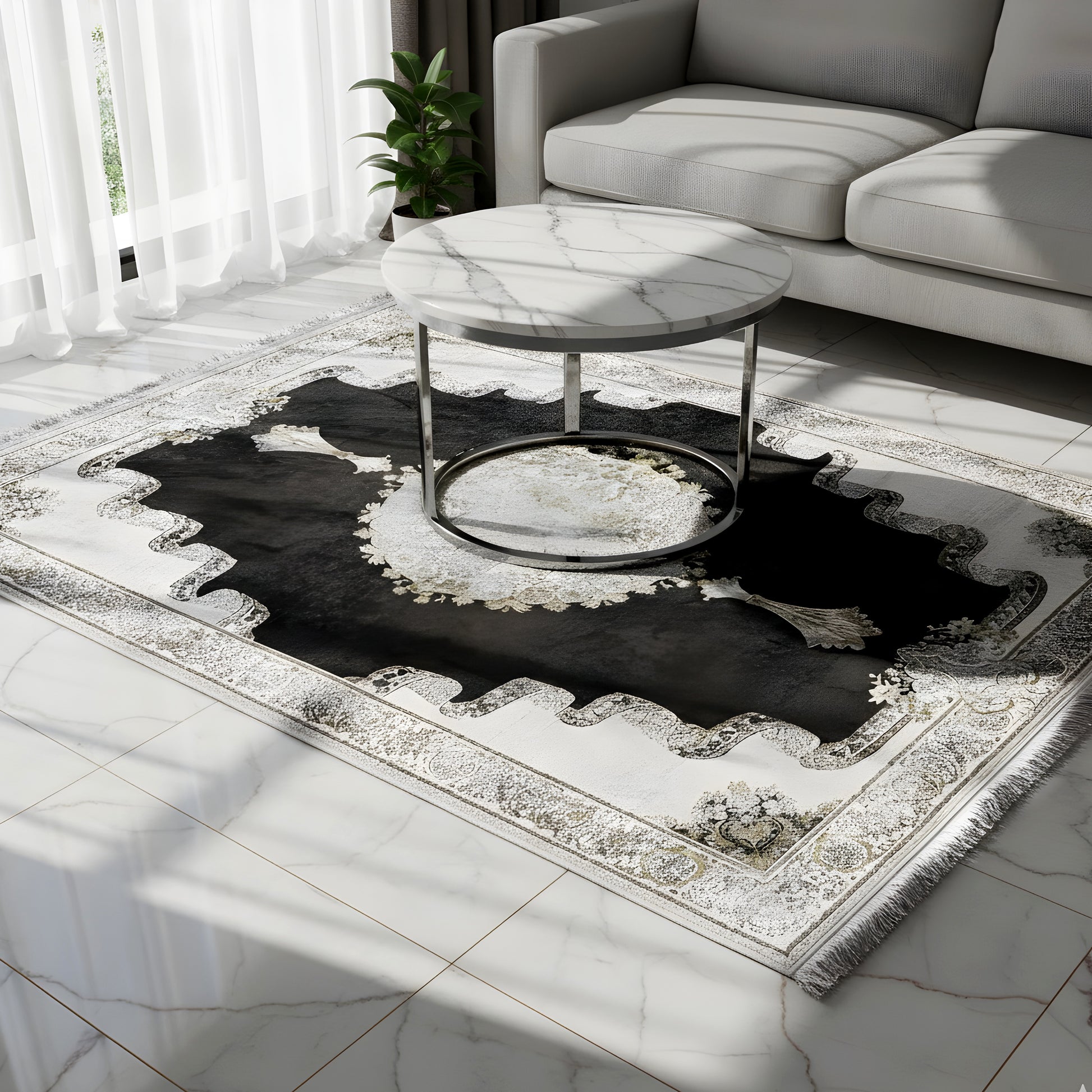 Add a touch of dramatic elegance to your home with this beautiful classic rug. Its striking dark inner field in smoke gray creates an impressive contrast to the light cream border and the intricately detailed medallion in the center. The unique border pattern adds an extra luxurious accent. Made from 100% heat-treated acrylic, this soft and durable rug is perfect for high-traffic areas, combining luxurious style with modern resilience. The generous size of 170x240cm is ideal for giving your living or bedroom an elegant focal point.