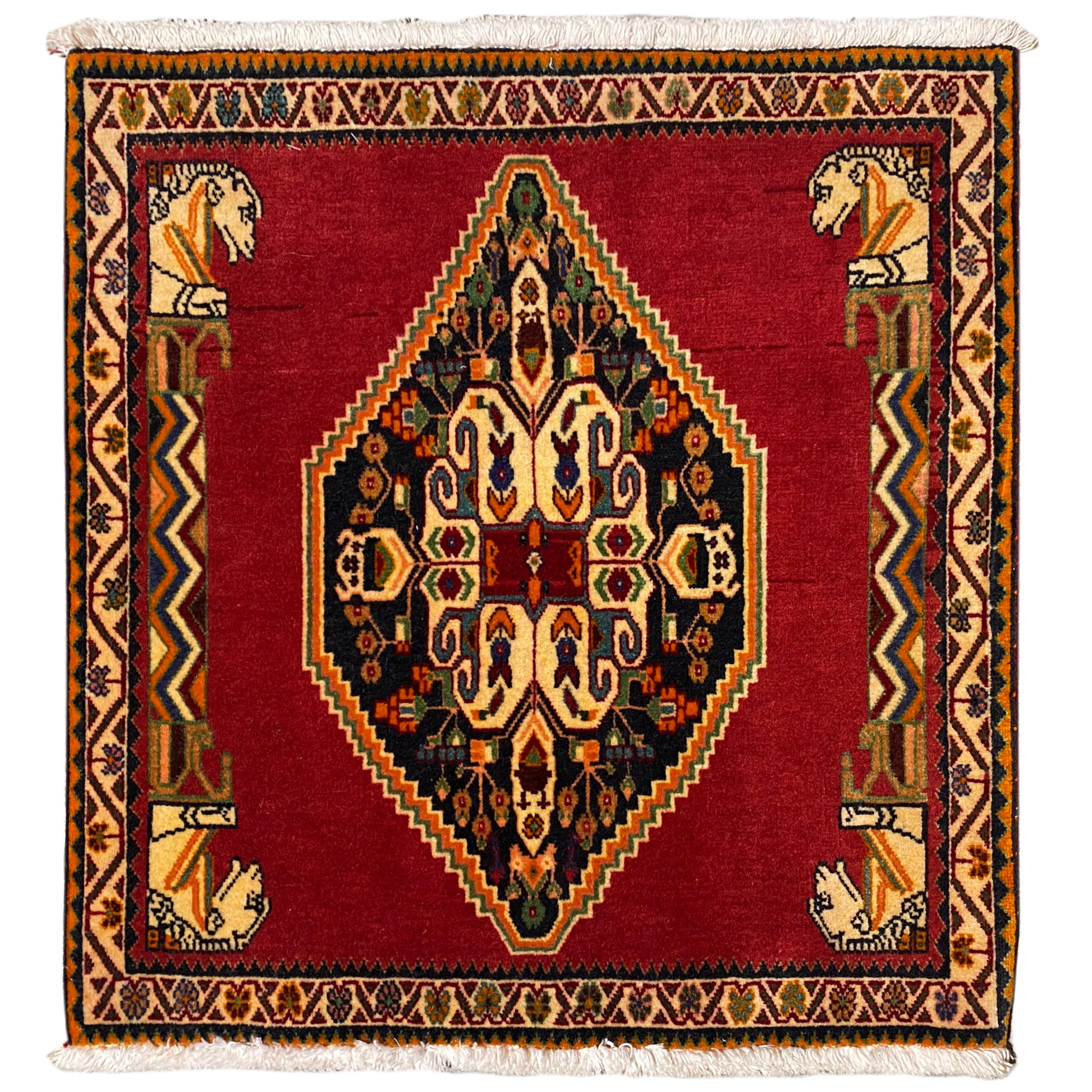 This exquisite, hand-knotted Poshti rug is an authentic masterpiece of the southern Iranian "Tork" tribal group, lovingly known as "Torkey." Measuring 64x62 cm, this unique piece made of wool and cotton features a strong red background framing a detailed central diamond medallion. Particularly striking are the stylized animal depictions in the side columns, giving this rug a distinctive character. Ideal for traditional settings, it enriches any room with its vibrant color palette and the deeply rooted culture of its origin.